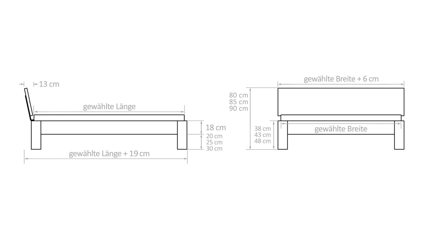 - Bettrahmenhöhe: 38 cm, 43 cm, 48 cm
