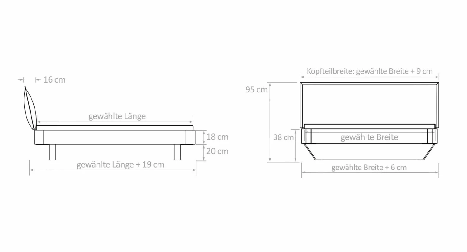 Breite + 9 cm - Kopfteilhöhe: 95 cm, 100 cm