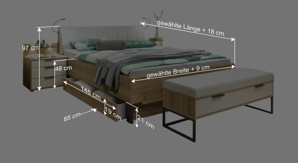 Breite + 9 cm - Kopfteilhöhe: 97 cm