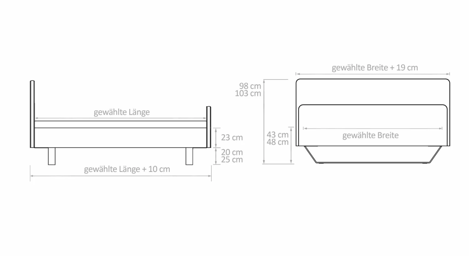 Breite + 19 cm - Kopfteilhöhe: 98 cm, 103 cm