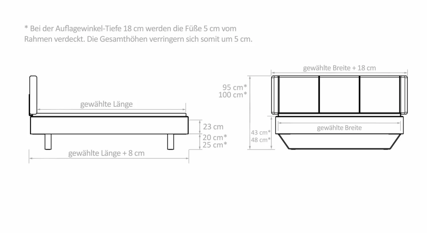 Breite + 18 cm - Kopfteilhöhe: 90 cm, 95 cm, 100 cm