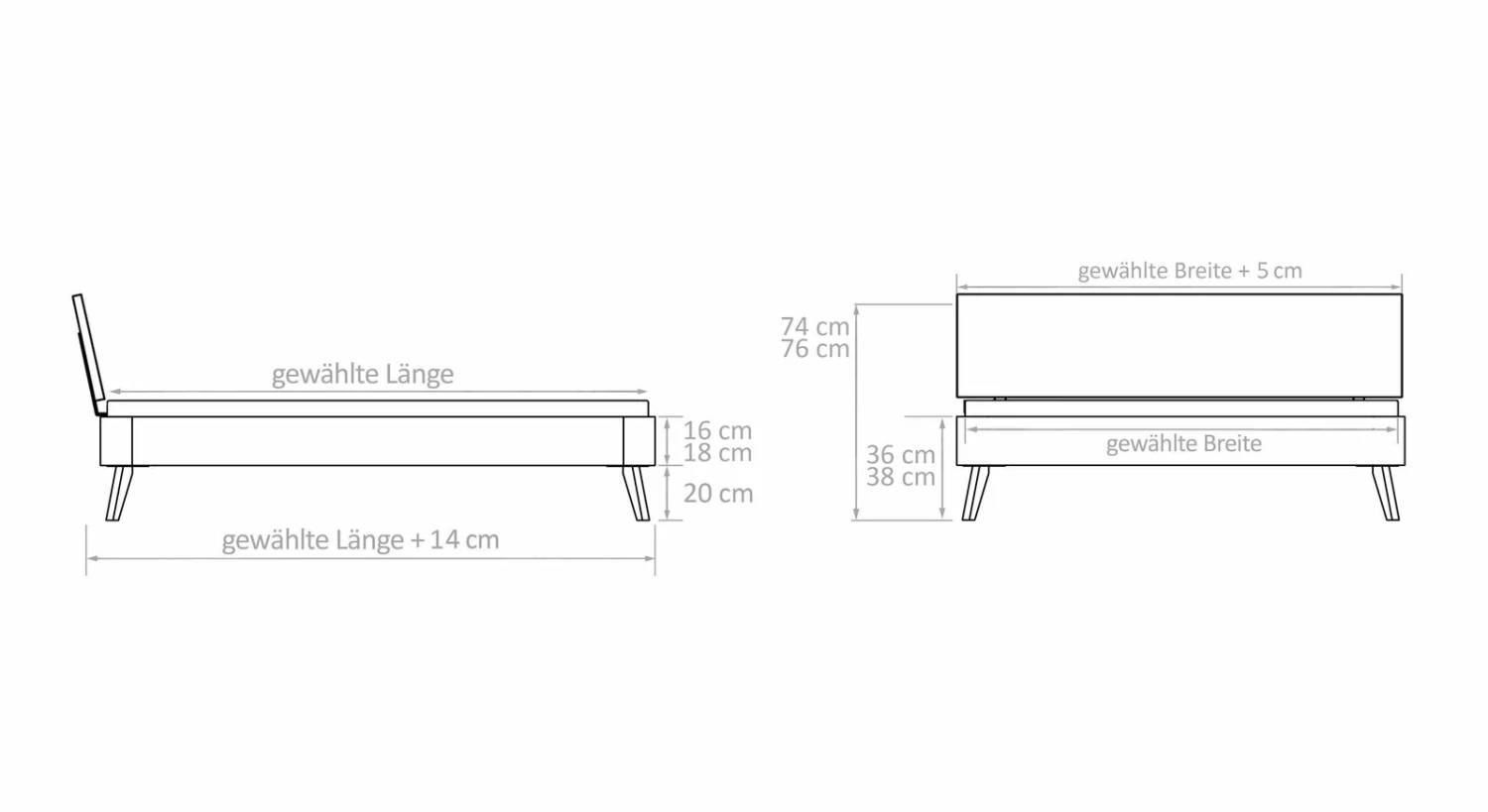 Breite + 5 cm - Kopfteilhöhe: 74 cm, 76 cm