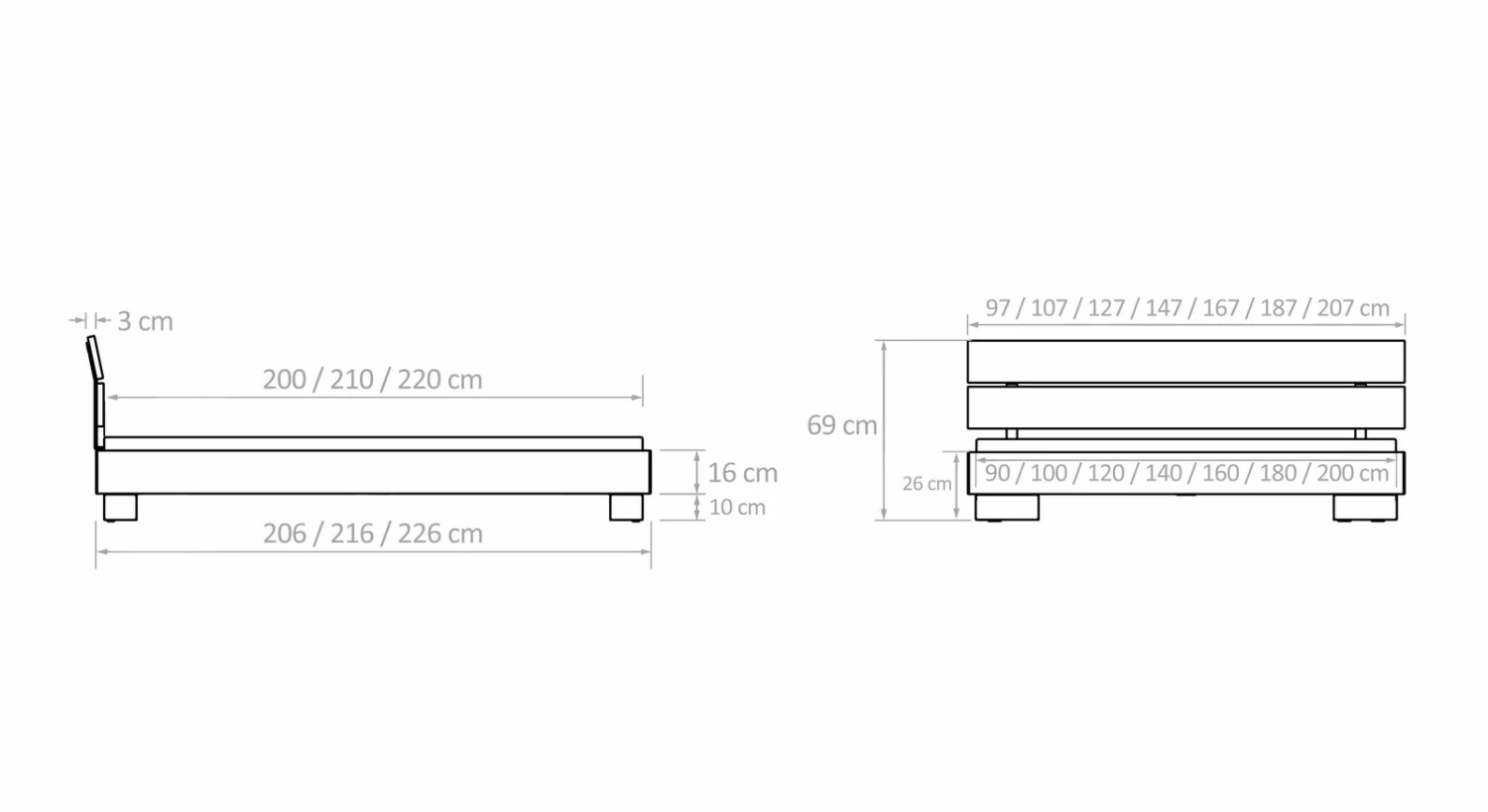Breite + 7 cm - Kopfteilhöhe: 69 cm