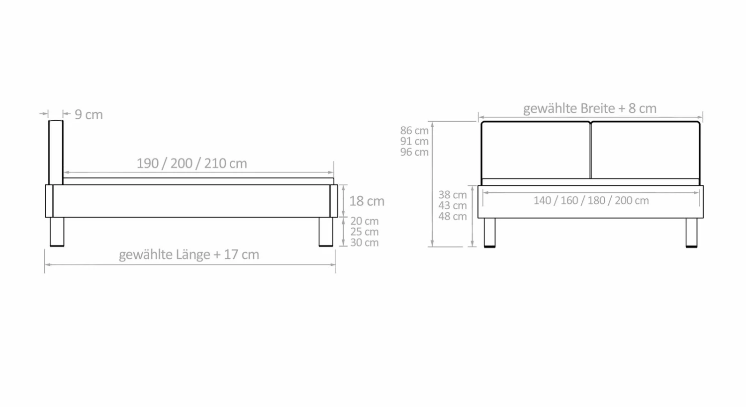 Breite + 8 cm - Kopfteilhöhe: 86 cm, 91 cm, 96 cm