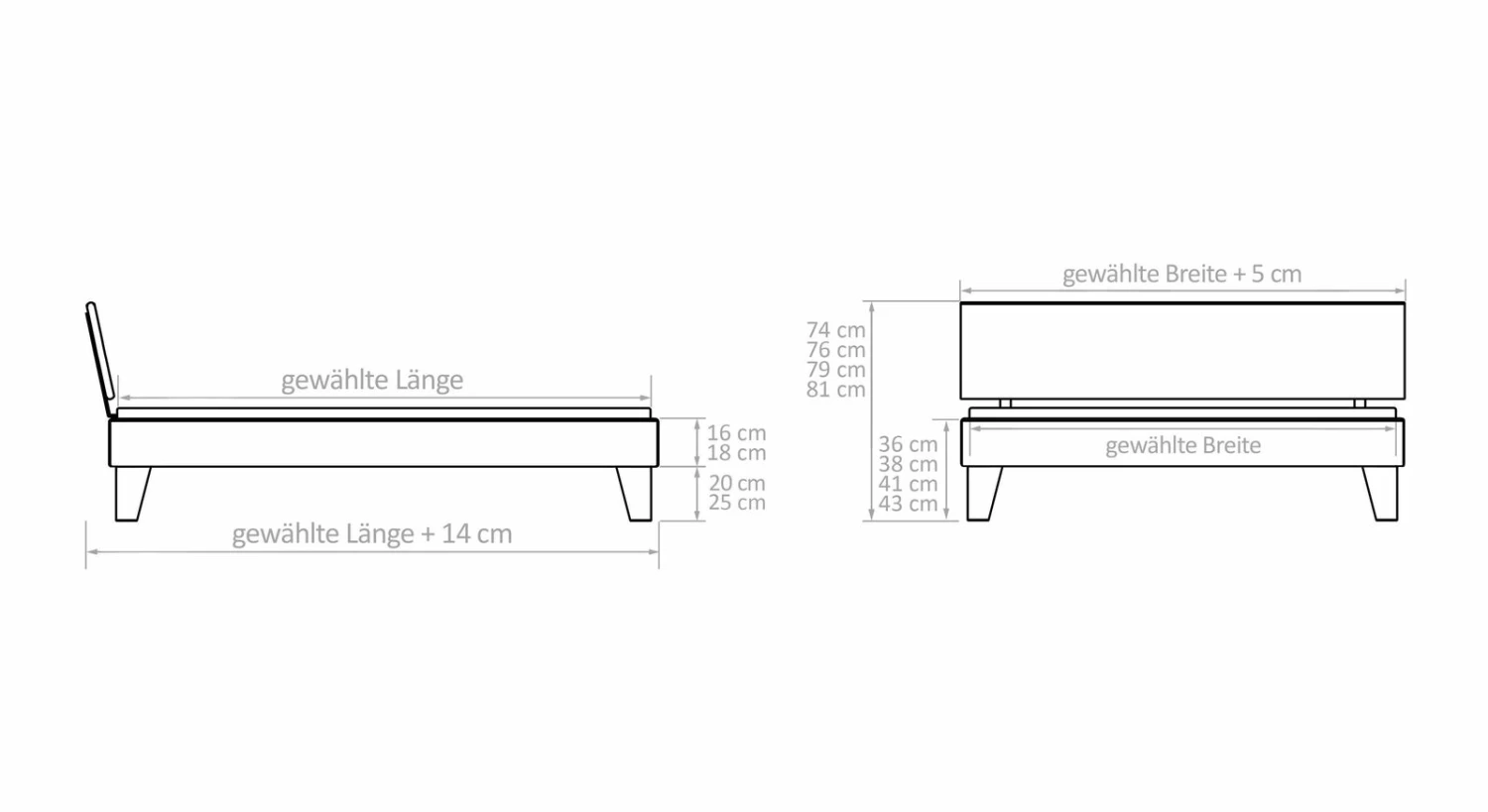 Breite + 5 cm - Kopfteilhöhe: 74 cm, 76 cm, 79 cm, 81 cm