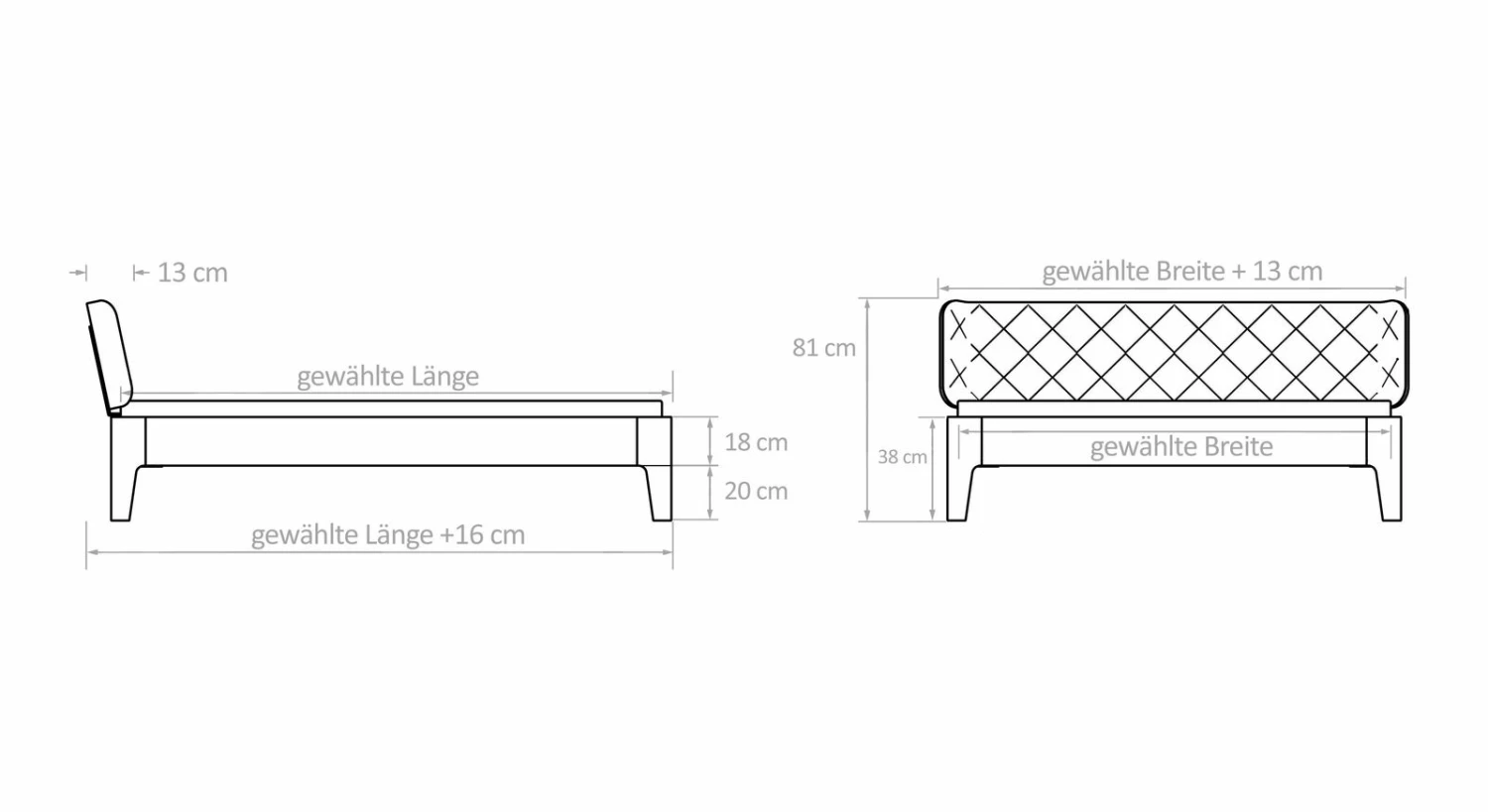 Breite + 13 cm - Kopfteilhöhe: 81 cm, 90 cm, 94 cm