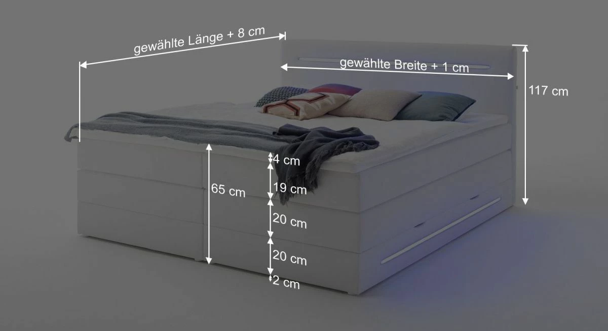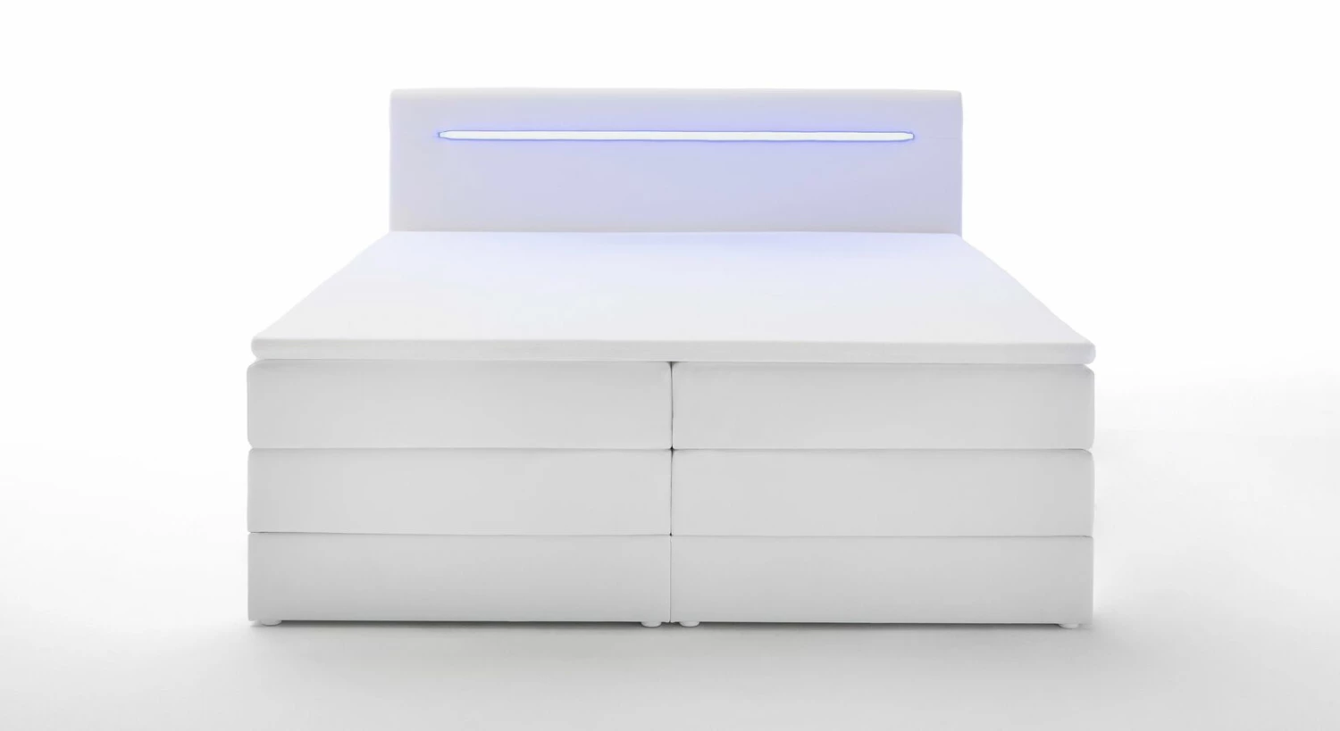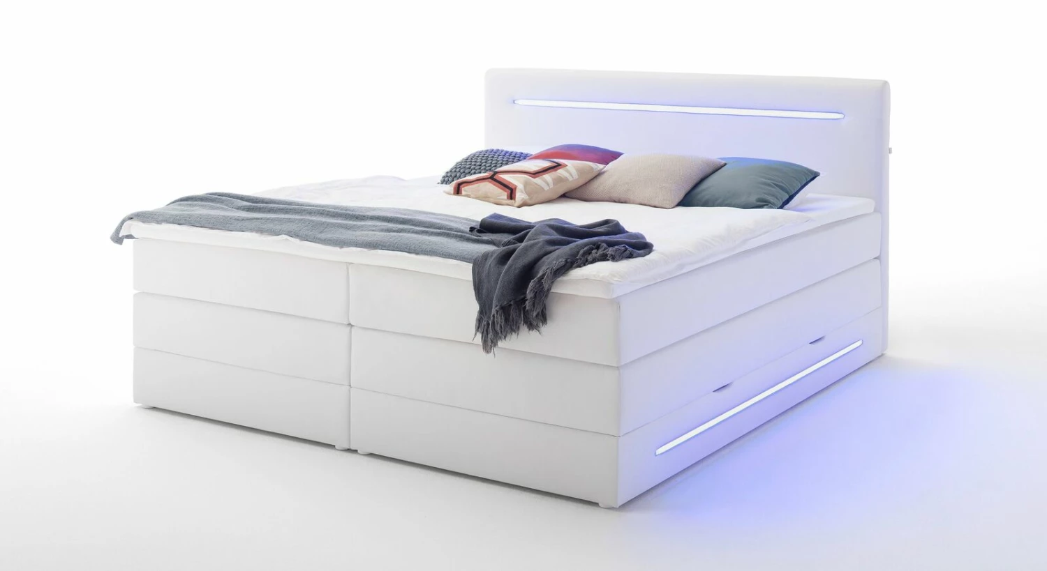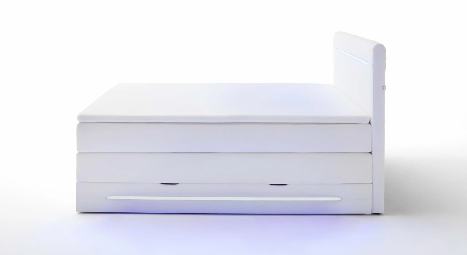 Extravagant und stylisch – das weiße Bettkasten-Boxspringbett „Tarasco“ mit LED-Beleuchtung
