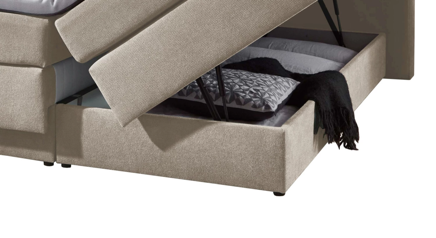 Damit Sie das Boxspringbett „Torin“ als Stauraum für Saisonkleidung, Kissen und Decken nutzen können, befinden sich unter den Bettseiten geräumige Bettkästen. Um an diese zu gelangen, heben Sie einfach die Boxspringbox an der Unterkante der Längsseite an und schon klappt die Liegefläche nach oben.