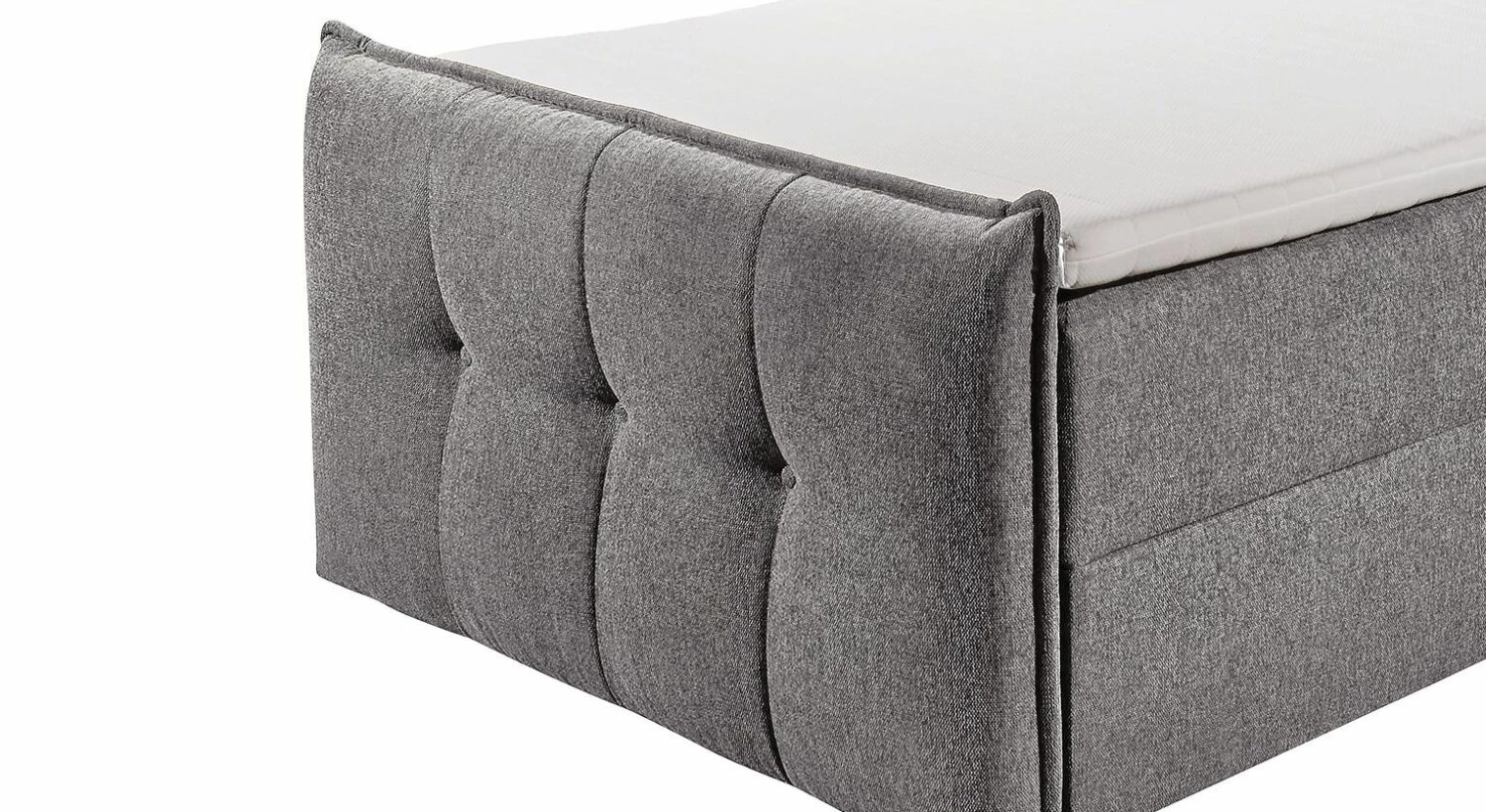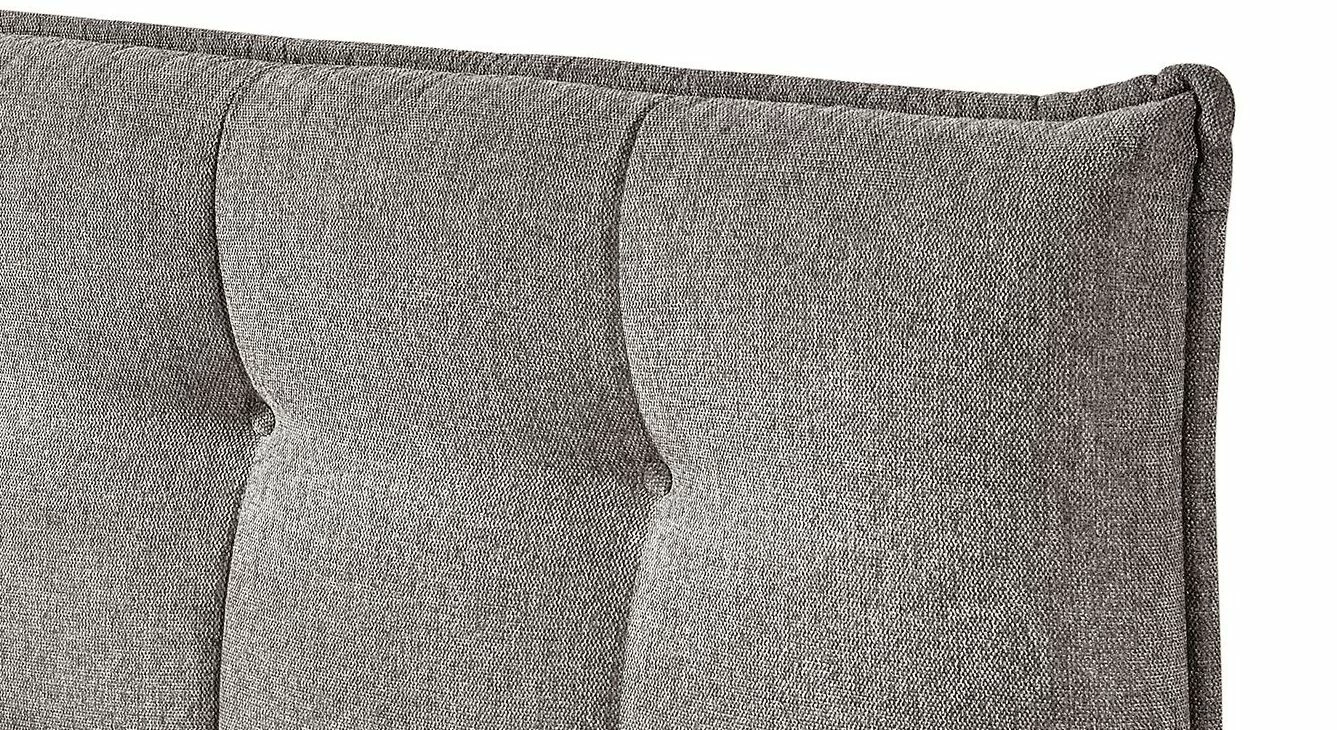 So zurückhaltend der graue Bezug wirkt, so auffallend ist seine Verarbeitung: Kopf- und Fußteil sind mit einer Längssteppung und tiefen Heftungen versehen. Darüber hinaus lockert eine umlaufende Biese beide Elemente nochmals gekonnt auf.