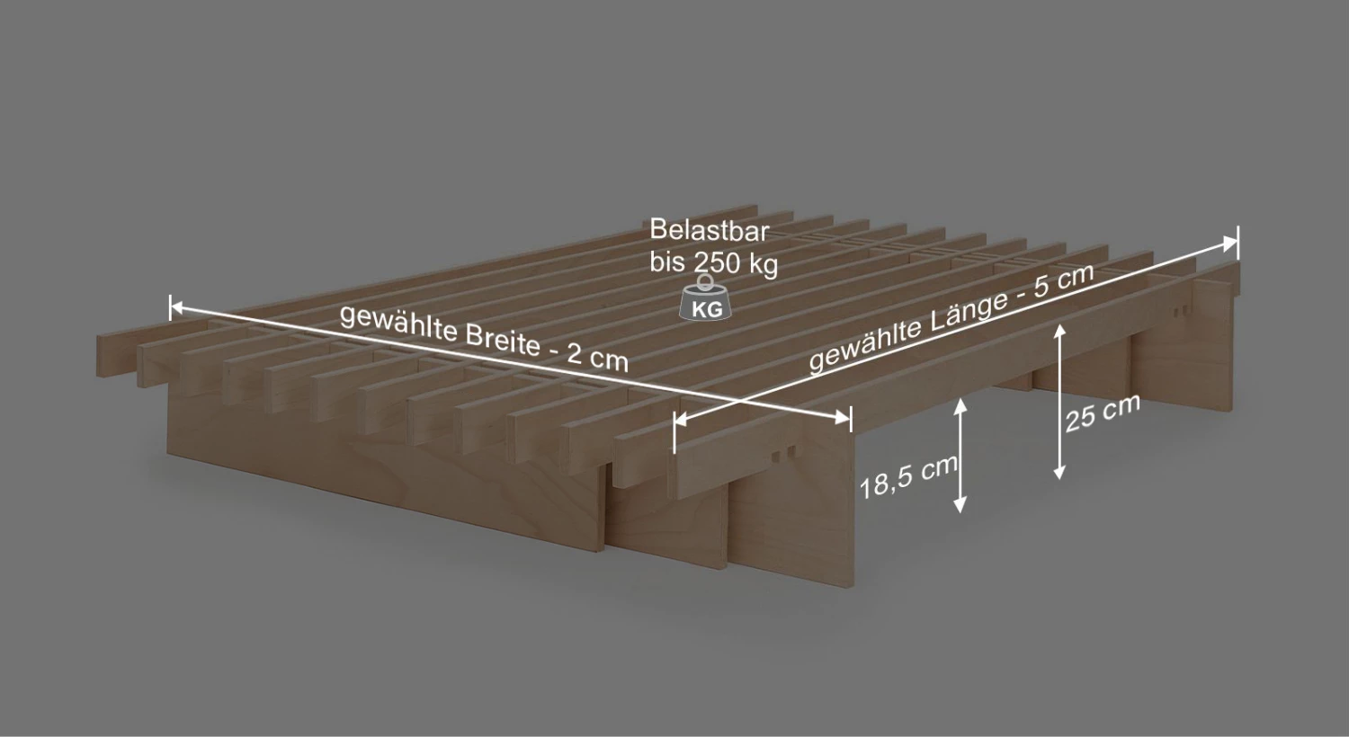 Breite – 2 cm - Bettrahmenhöhe: 25 cm