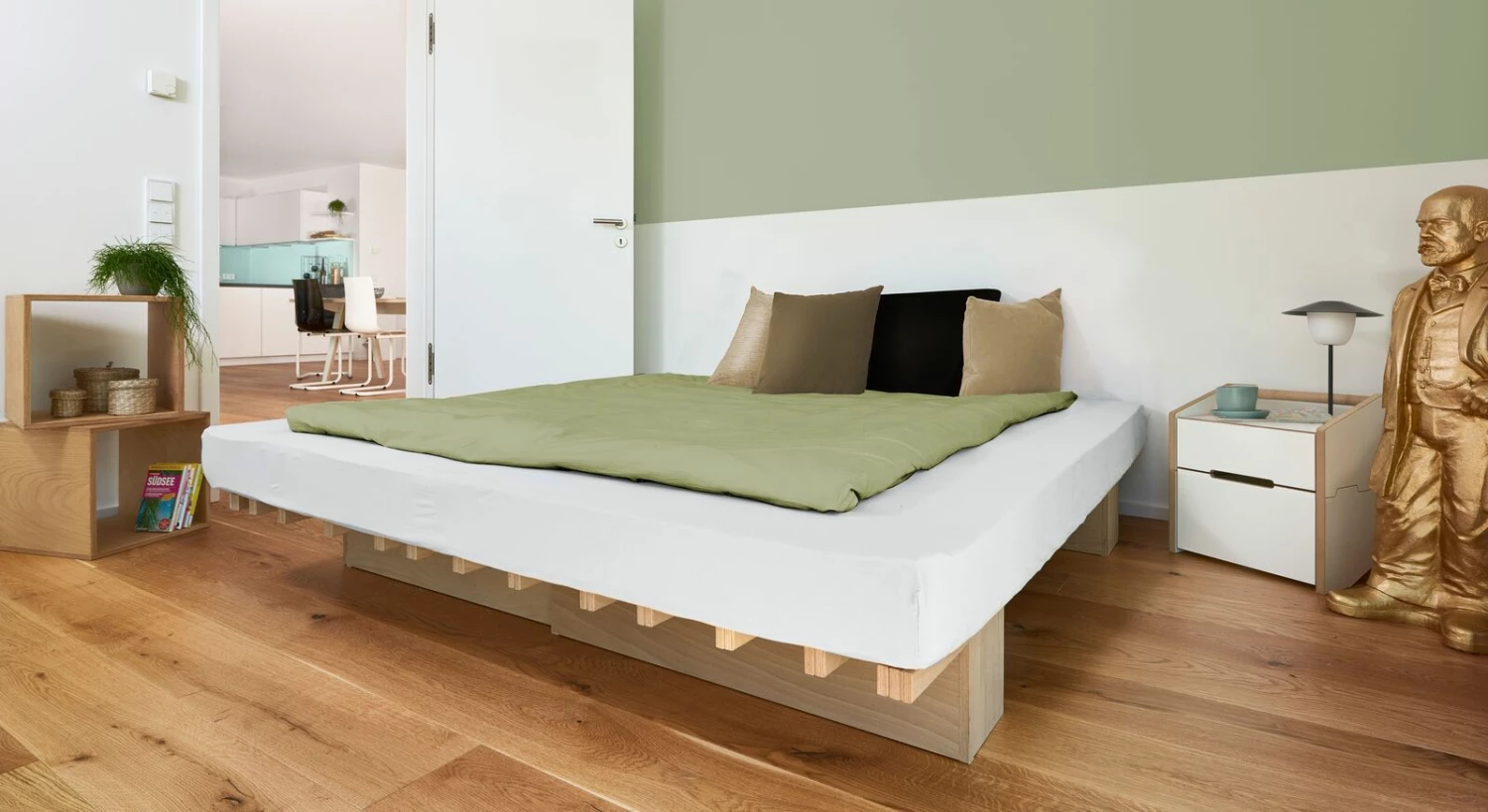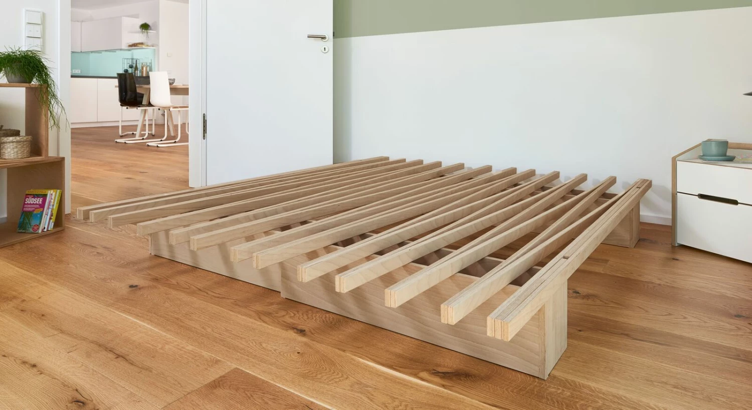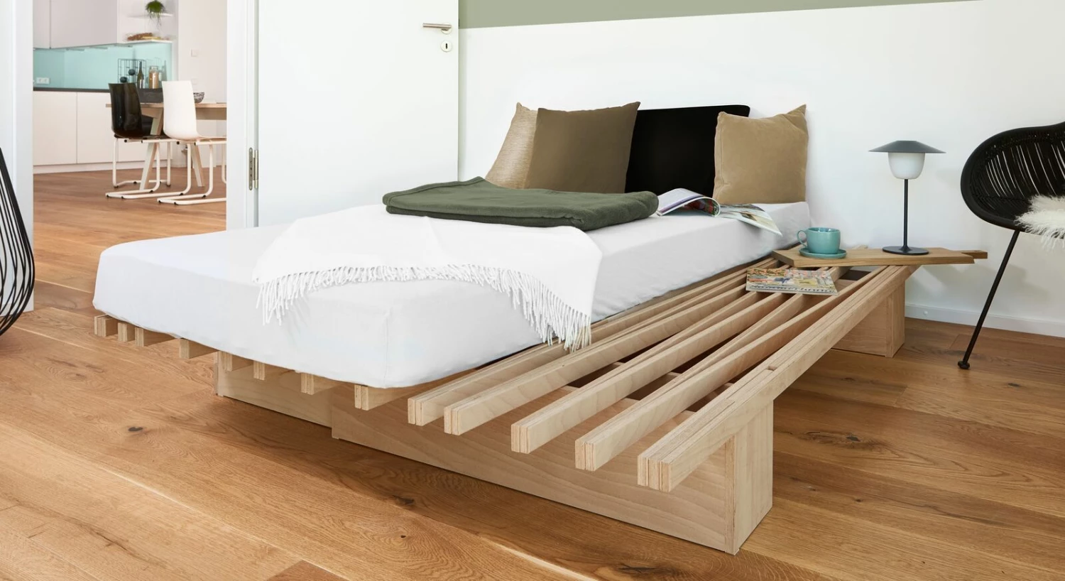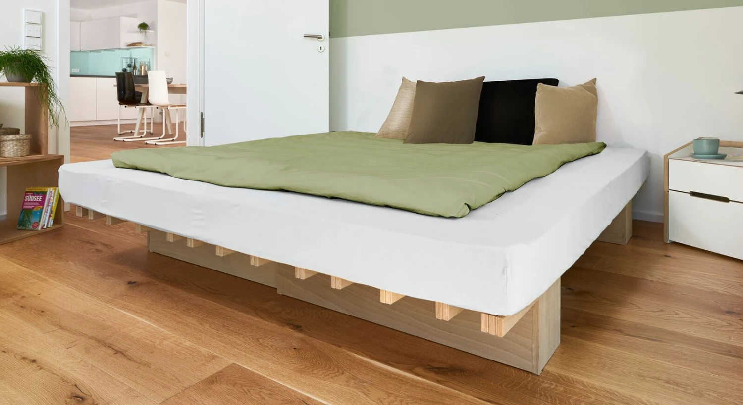 Das Holz wird sorgfältig geschliffen und entgratet, sodass eine glatte Oberfläche mit sanften Kanten entsteht, die keine weitere Behandlung benötigt. Das Holz behält seine natürliche Struktur, kann frei atmen und so zu einem ausgeglichenen Raumklima beitragen.