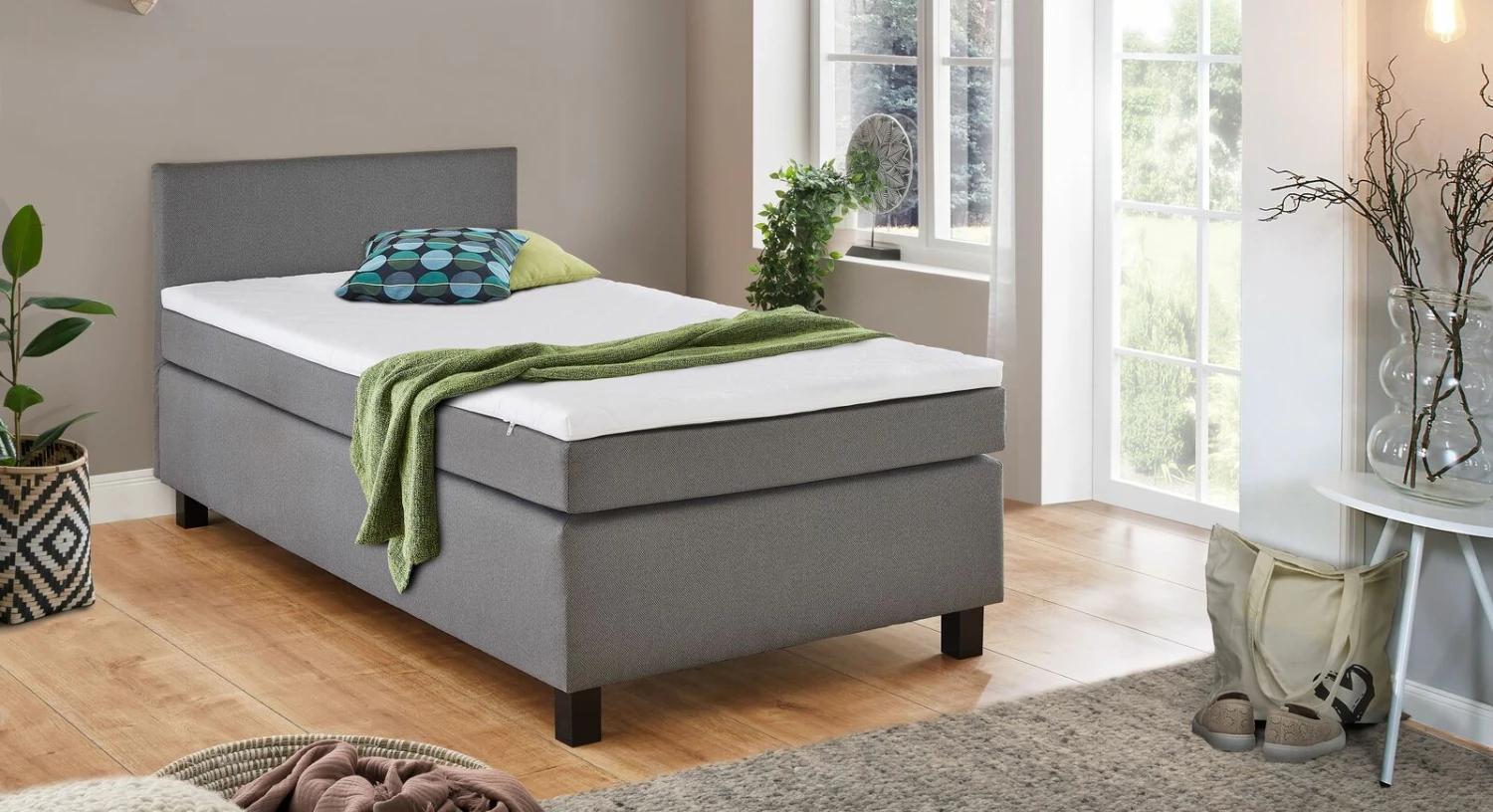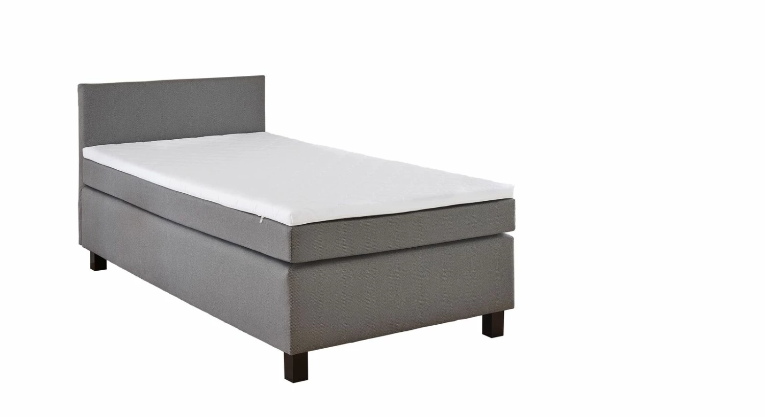 Einfaches Boxspring-Einzelbett „Lucan“ mit schickem Webstoff in Silbergrau mit Federkernmatratze und Topper