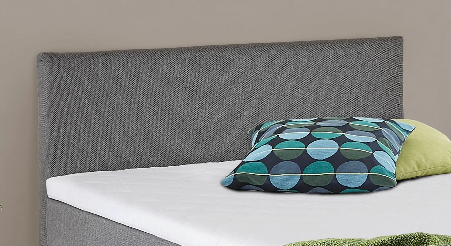 Das schlichte Kopfteil ist gepolstert und vorne passend zum Bett mit demselben silbergrauen Webstoff bezogen. Die Rückseite des Kopfteils ist mit farblich abweichendem Blendstoff versehen, sodass es sich empfiehlt, das Bett direkt an die Wand zu stellen.