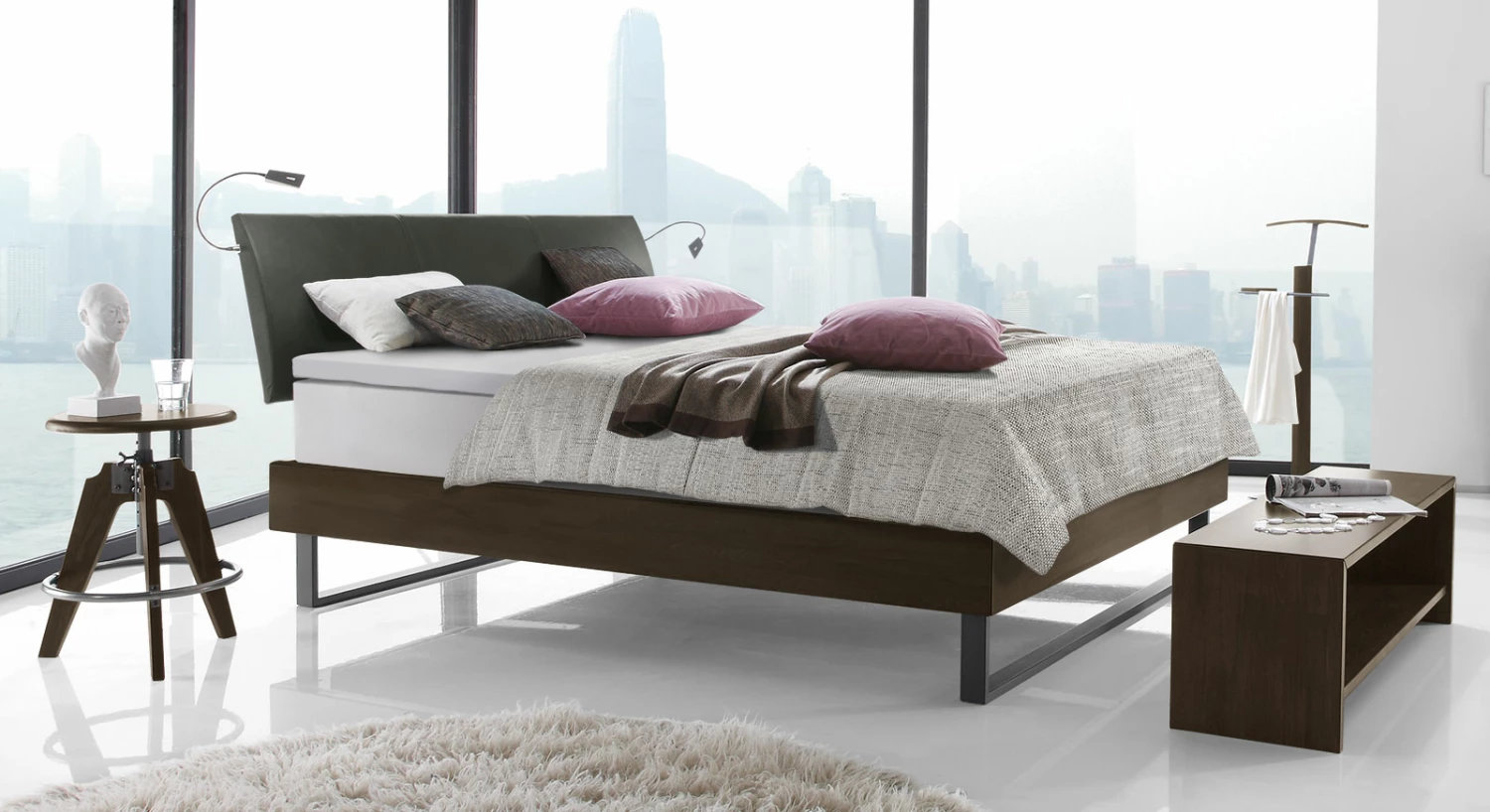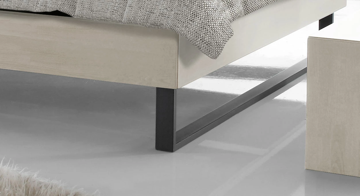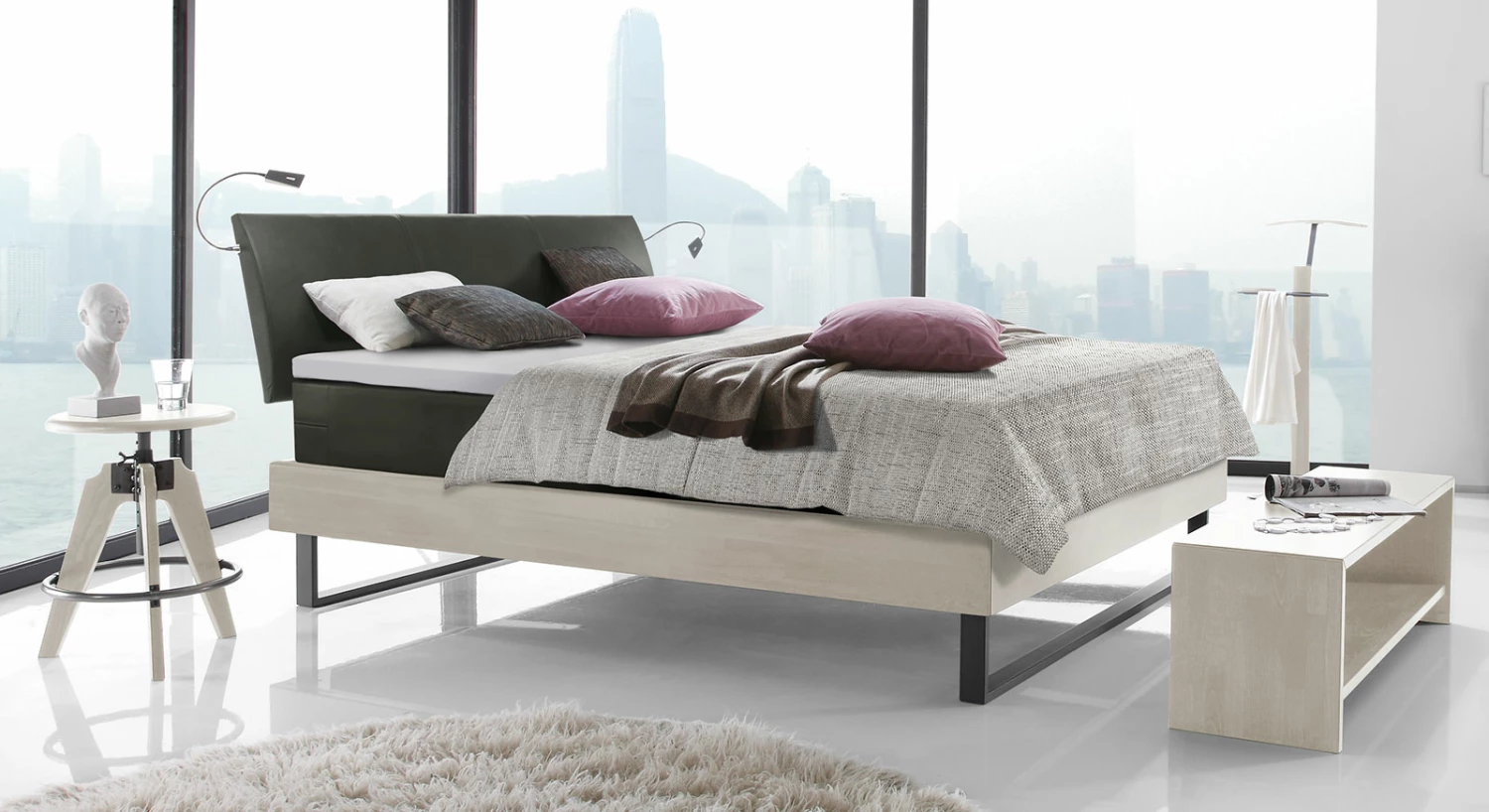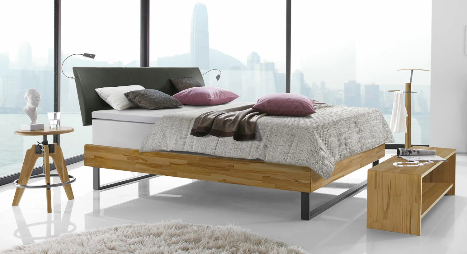 Auch optisch überzeugt das Boxspringbett „Agia“ auf ganzer Linie: Sein leichtfüßiges Design mit den anthrazitfarbenen Metallkufen und dem in diversen Farben erhältlichen massiven Buchenholz-Rahmen wirkt zeitlos elegant.