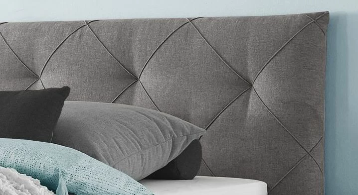 Das wohl Markanteste am Boxspringbett „Aidan“ ist die außergewöhnliche Gestaltung des Kopfteils und der Box. Beide sind sanft aufgepolstert und mit einem weichen, grauen Microvelours-Bezug versehen. Während die Box über senkrechte Steppungsnähte verfügt, begeistert das hohe Kopfteil mit seiner Rautensteppung samt tiefen Heftungen.