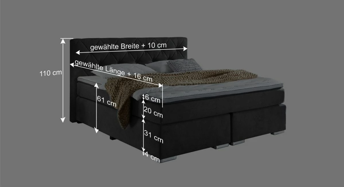 Die Basis bildet die schon erwähnte Taschenfederkern-Box. Sie sorgt für die optimale Stützwirkung von unten. Darauf liegt eine Matratze, die Sie je nach gewünschtem Härtegrad auf der einen oder anderen Seite nutzen können. Ein Viskoschaum-Topper rundet das feste Liegegefühl ab.