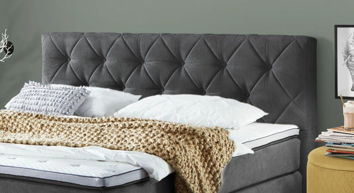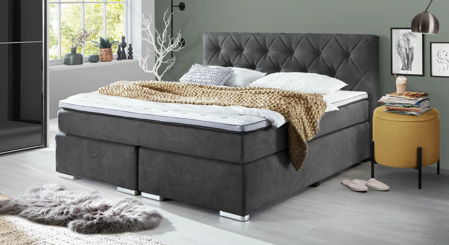Auf den Füßen thronen Box und Matratze, das Kopfteil mit seiner spannenden Steppung und Heftung bildet den optischen Abschluss des Bettes. Diese drei Elemente sind in einen dunklen, grauen Webstoff gehüllt, was dem gesamten Boxspringbett eine sehr erhabene Optik verleiht.