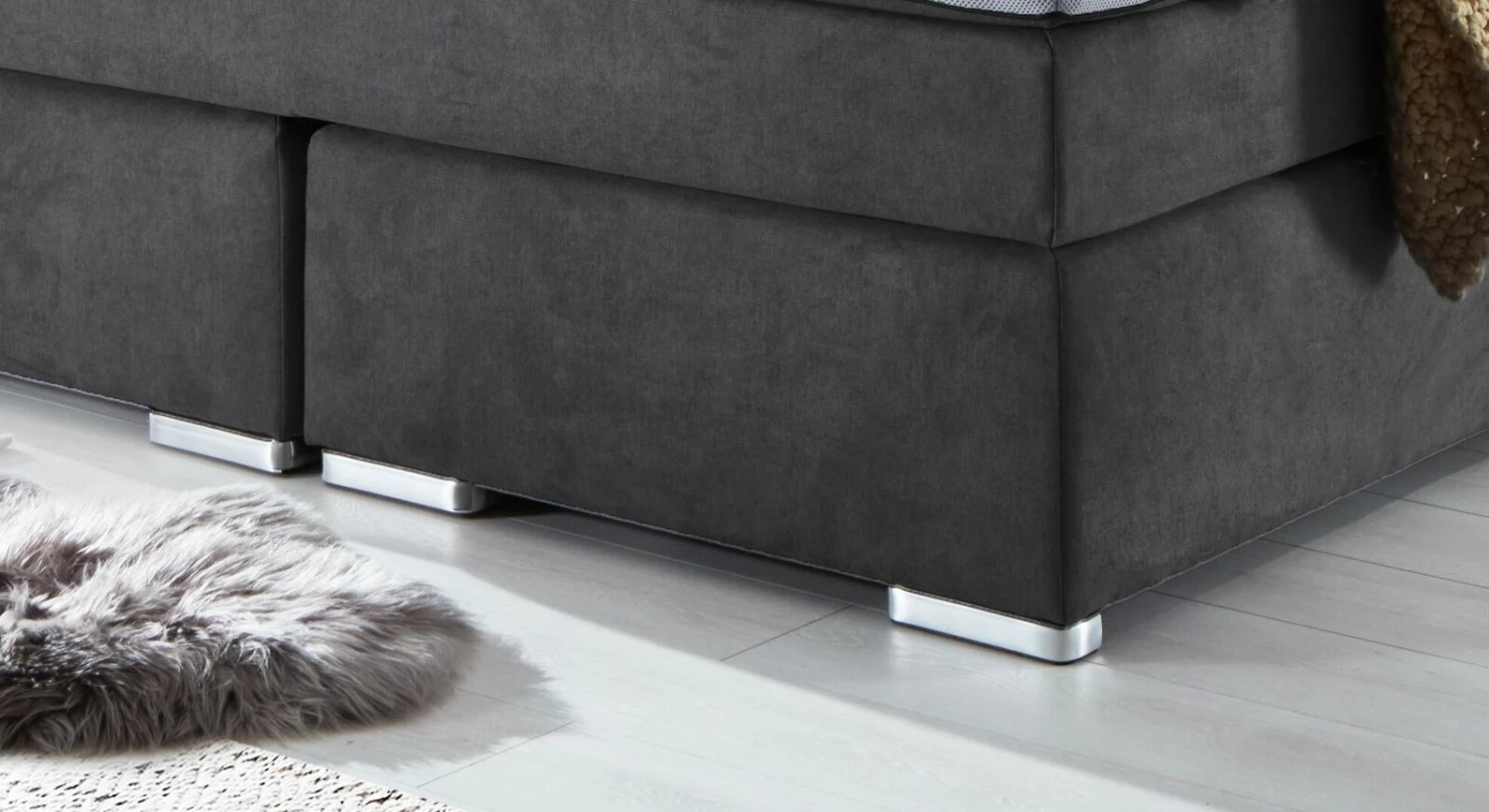 Für die Standfestigkeit des Boxspringbettes „Bryce“ sorgen die Füße aus Massivholz. Am Bettende sind diese zusätzlich mit verchromten Kunststoffleisten verziert, um dem Bett einen modernen Twist zu verleihen.