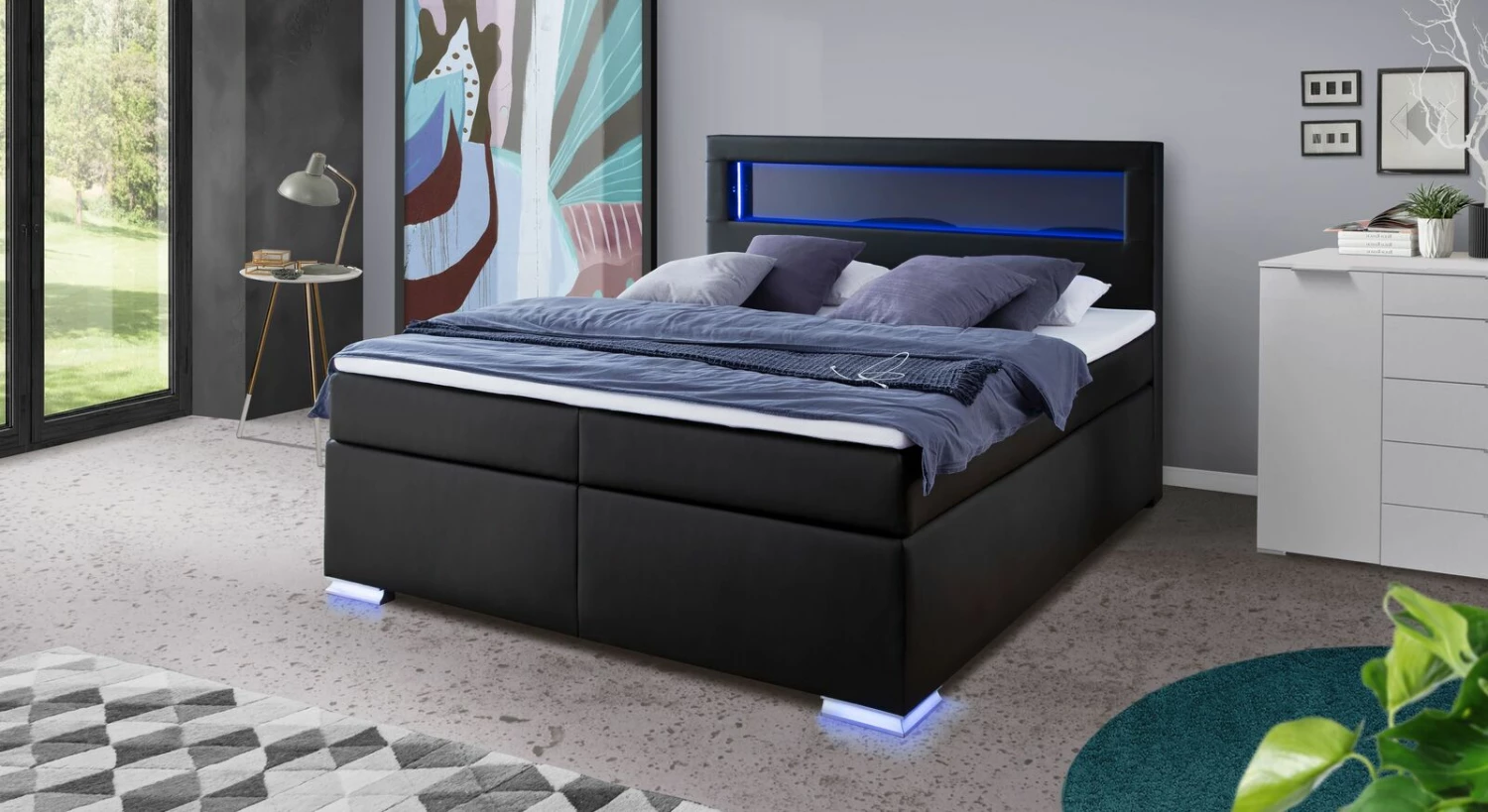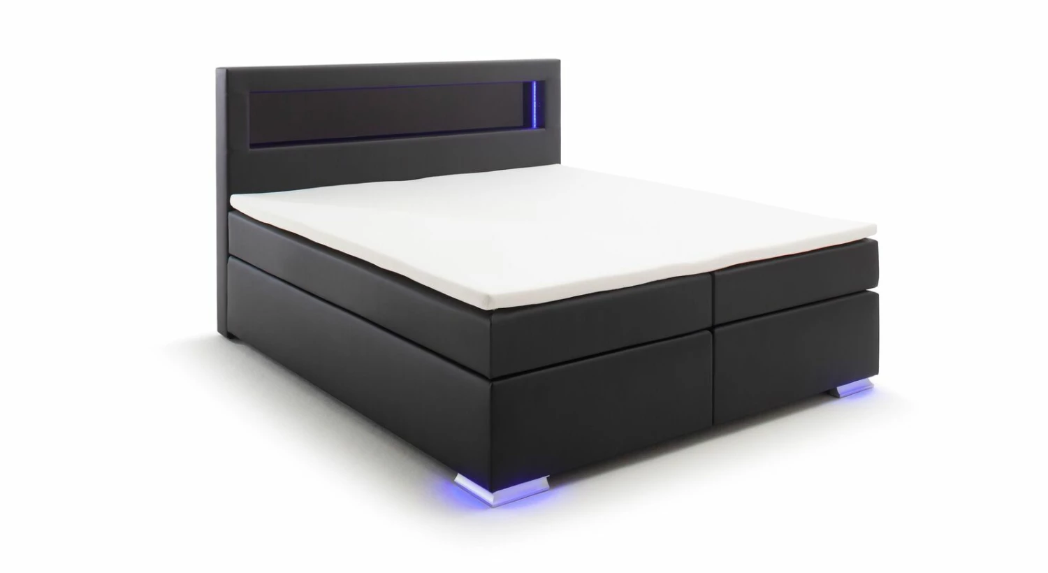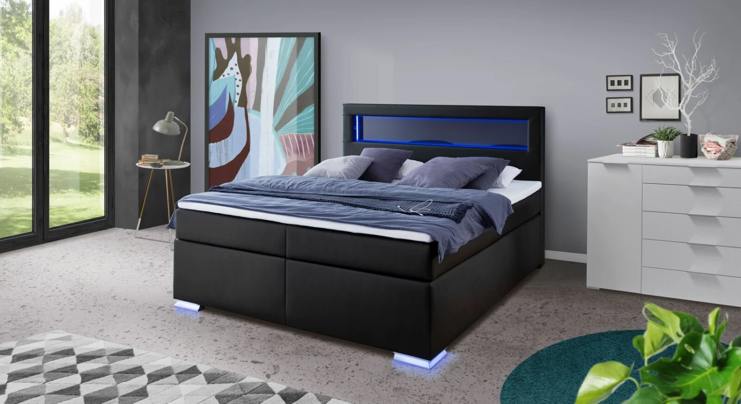 Schwarzes LED-Boxspringbett „Cresella“ Express mit Kunstlederbezug und USB-Anschlüssen