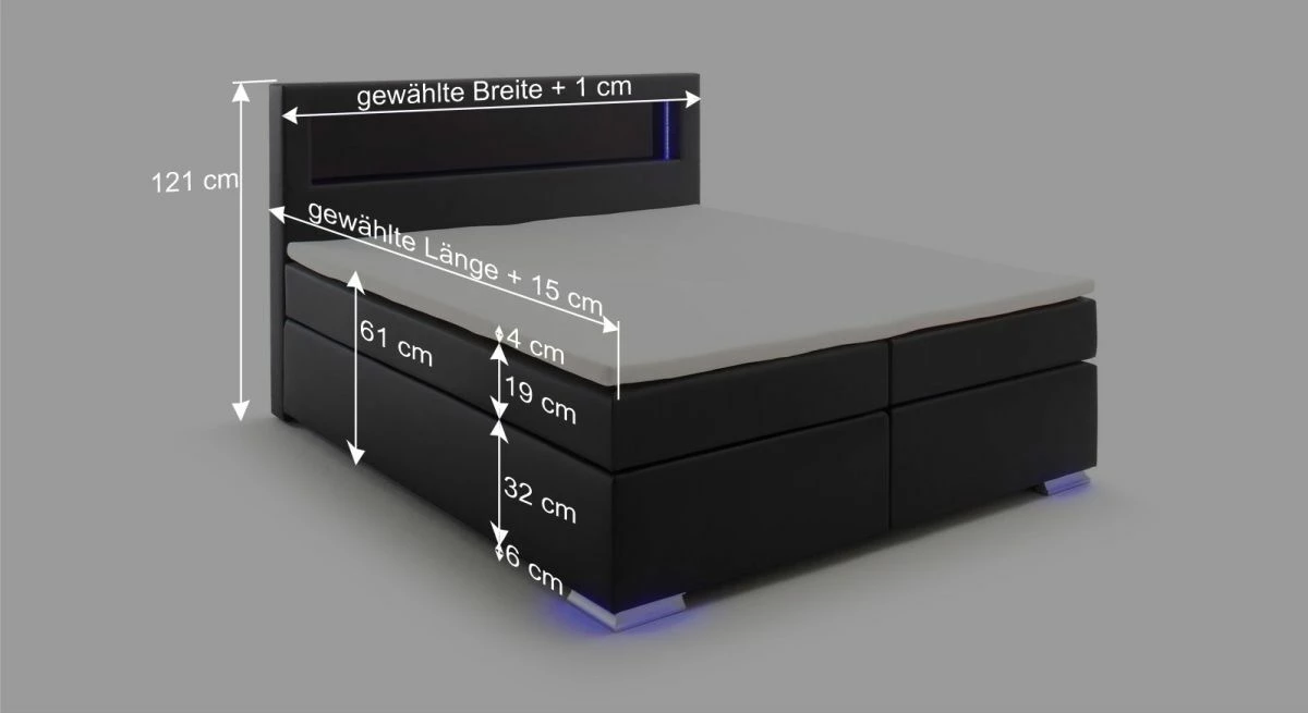 Das Highlight des Boxspringbettes „Cresella“ Express ist neben der komfortablen Bettausstattung mit Sicherheit das Kopfteil. In ihm befindet sich eine dunkel getönte Spiegelfolie, die für spannende Lichteffekte sorgt. Dafür nutzen Sie einfach die integrierte LED-Beleuchtung, die verschiedene Farben bietet. Zum An- und Ausschalten und zur Einstellung des gewünschten Modus nutzen Sie die mitgelieferte Fernbedienung, die dann auch die Füße im gewählten Licht erstrahlen lässt.