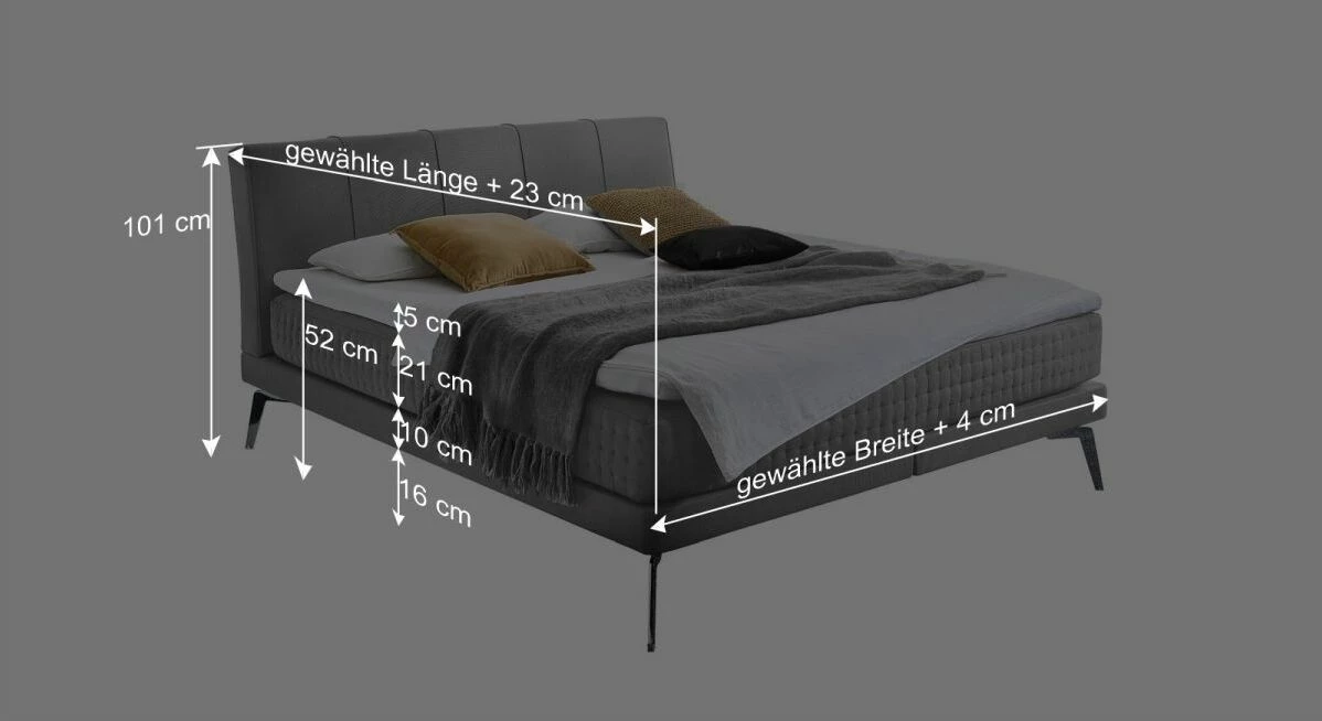 Die Matratze selbst ist für alle Schlafpositionen optimal geeignet ist. Dafür sorgen die einzelnen in kleine Taschen eingenähten Federn der elastischen 5-Zonen-Matratze und der darunterliegenden Box. Übrigens: Die Federn sind thermisch vergütet. Mit diesem speziellen Verfahren wird das Metall vorab gehärtet und besonders robust gemacht. Somit ist Langlebigkeit garantiert und Sie werden viele Jahre Freude mit Ihrem neuen Möbelstück haben.