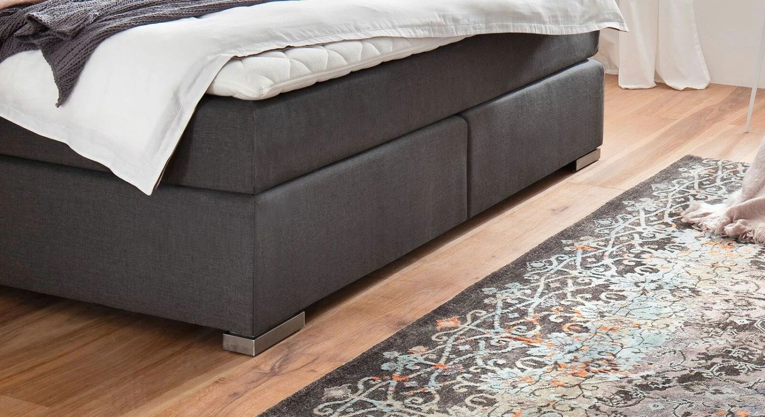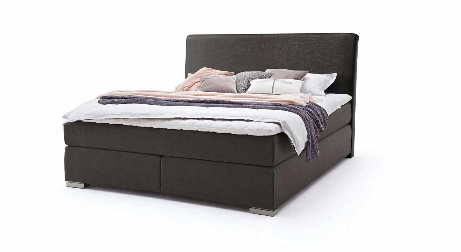 Als gemütliches Element verfügt das Boxspringbett „Esperia“ Express über ein hohes, geradliniges Polster-Kopfteil, das passend zu den Seiten von Box und Matratze mit einem weichen anthrazitfarbenen Webstoff bezogen ist. Für die Standfestigkeit des Bettes sorgen die charmanten Füße aus gebürstetem Metall.