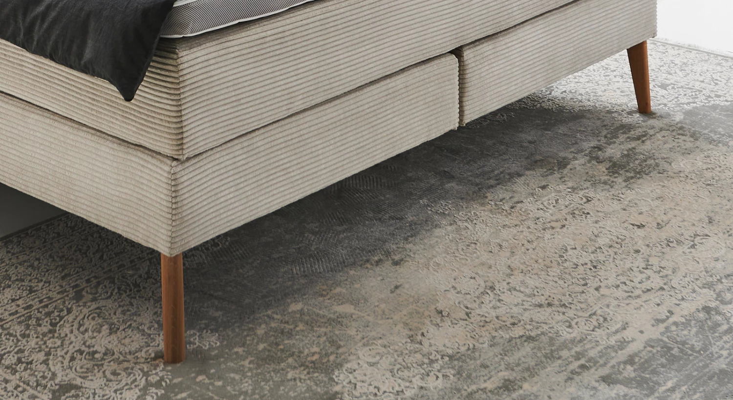 Optisch begeistert die Schlafstätte mit einem modernen Design, das durch abgerundete Kanten am Kopfteil und ausgestellte Massivholzfüße angenehm aufgelockert wird. Als Bezug für Box, Matratze und Kopfteil dient ein beigefarbener Cord-Stoff mit quer verlaufender Zeichnung.