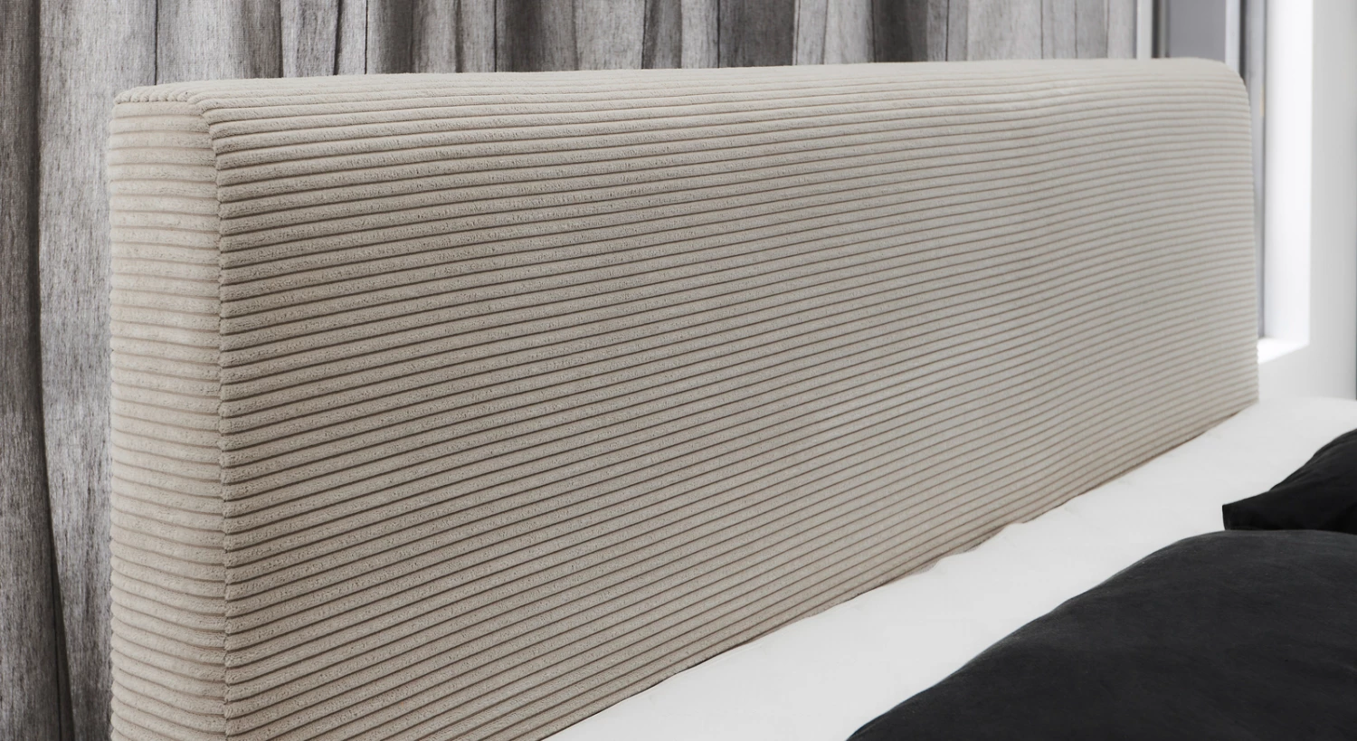 - Hohes Kopfteil mit elegantem Stoffbezug in Cord-Optik