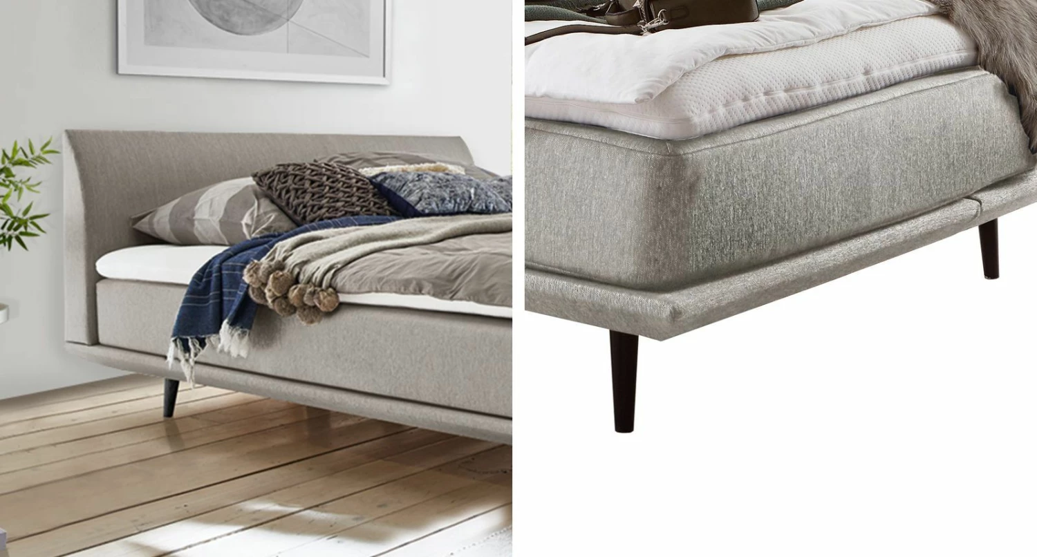 Luftiges Boxspringbett „Lajana“ im dezenten Skandi-Look mit schwarzen Holzfüßen