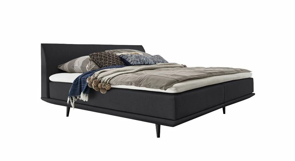 Für einen kühlen Kontrast sorgen die modern ausgestellten Füße aus schwarzem Eichenholz. Sie heben das Boxspringbett „Lajana“ sanft an und nehmen ihm so die Wuchtigkeit.