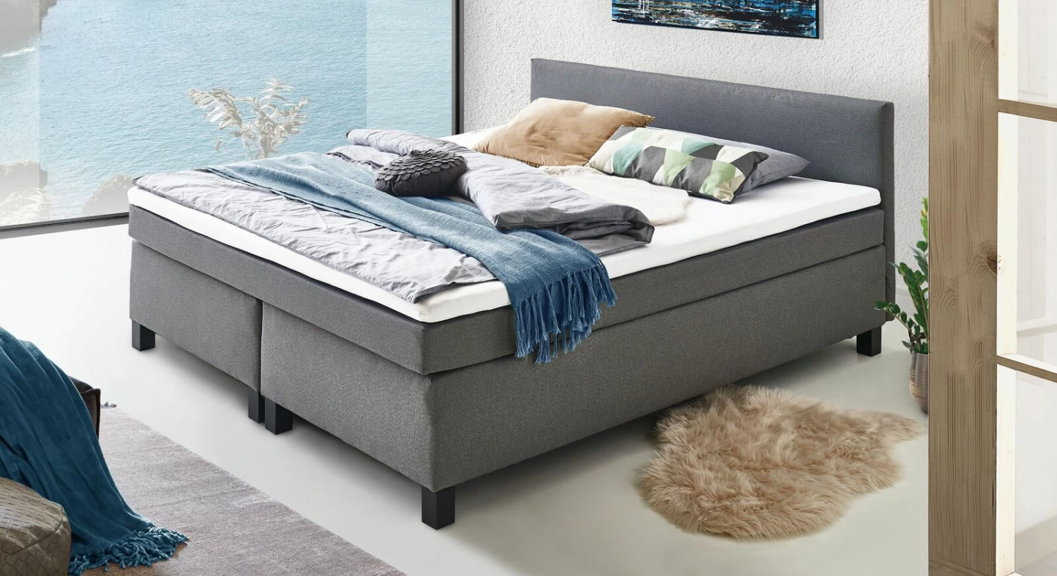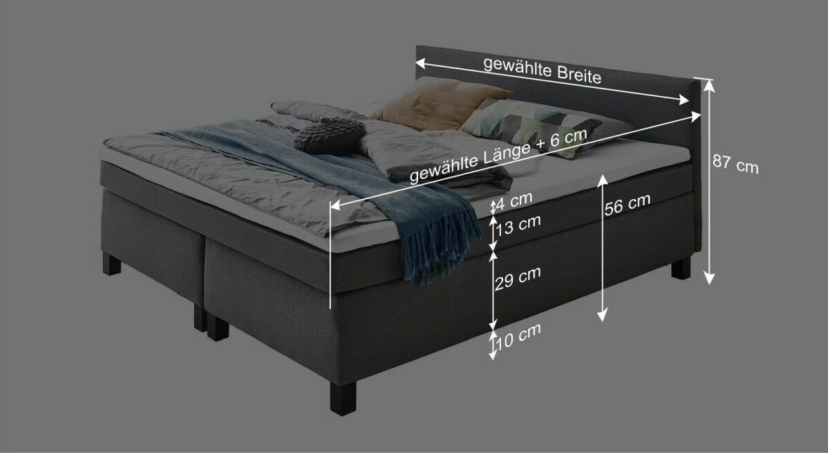 - Boxen, Matratze und Kopfteil bezogen mit robustem Webstoff