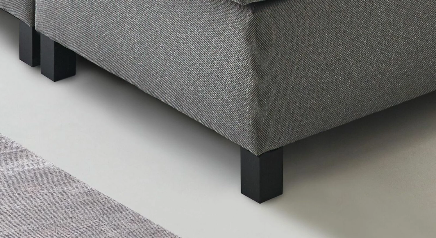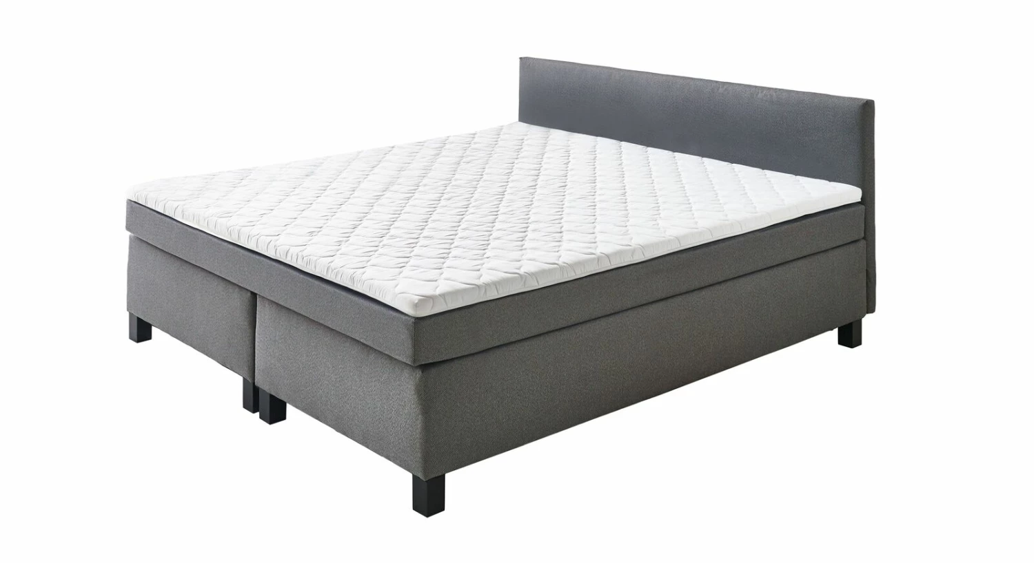 Das gerade Kopfteil ist gepolstert und fügt sich perfekt in den schlichten Look des Boxspringbettes ein. Getragen wir das stabile Bett von schwarzen Kunststofffüßen, die zusammen mit dem silbergrauen Bezug für einen harmonischen Look sorgen. Damit das Boxspringbett stabil steht, ist jede Seite mit jeweils fünf Beinen ausgestattet.