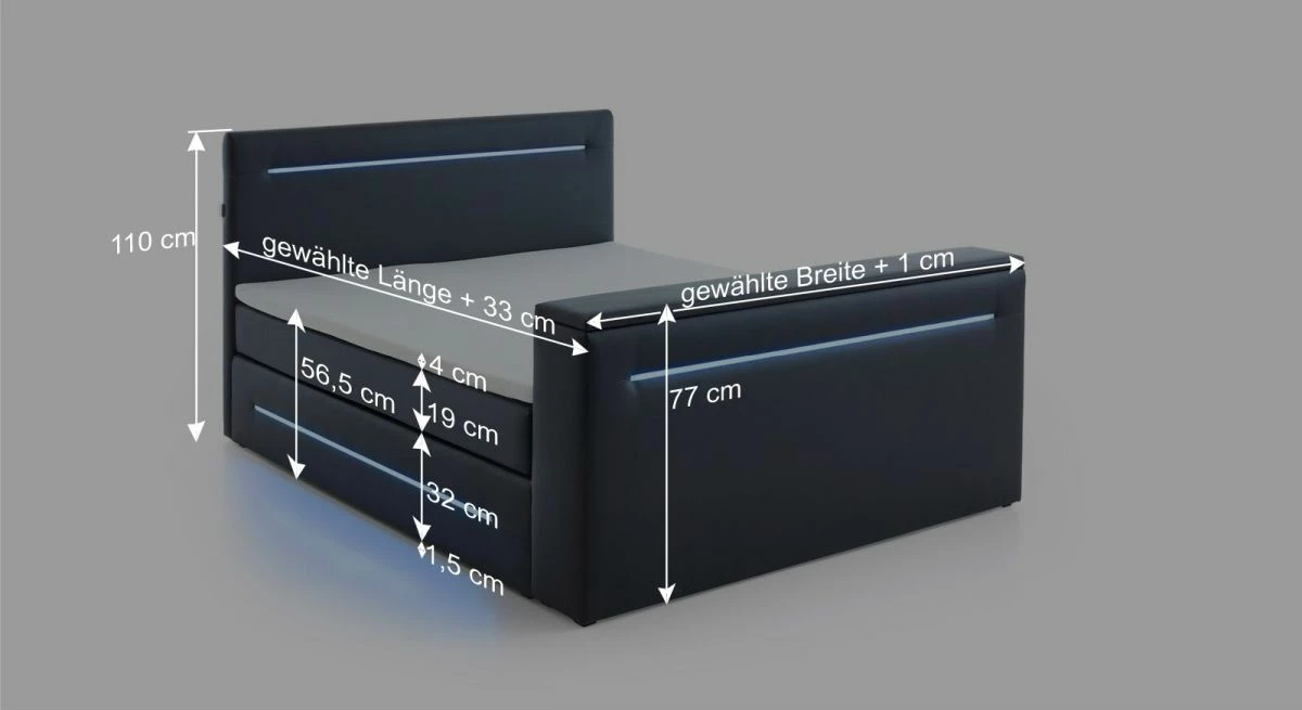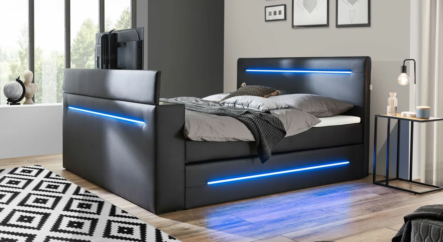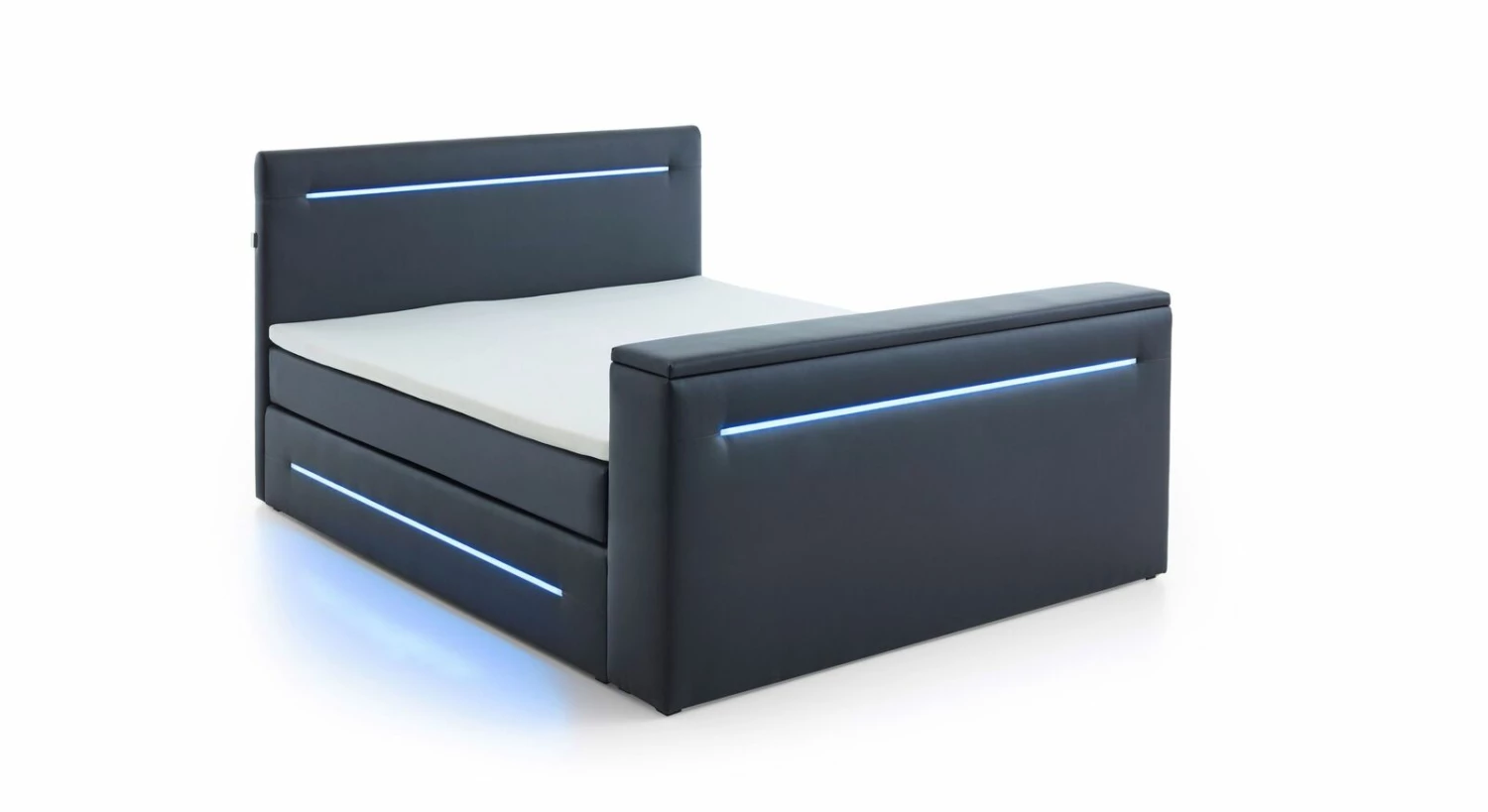 Schwarzes LED-Boxspringbett „Lucaro“ Express mit elektrischer TV-Halterung und USB-Anschlüssen