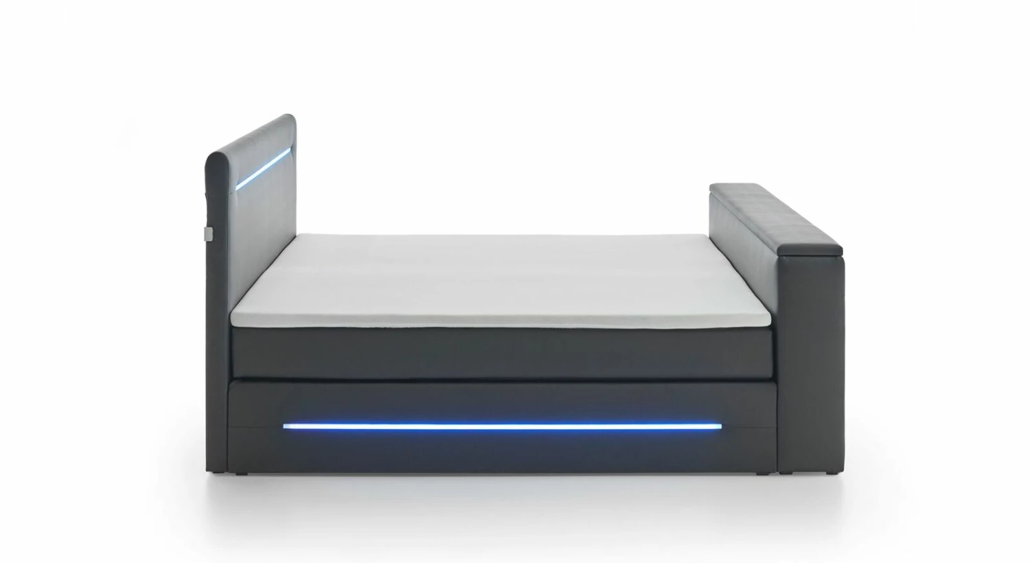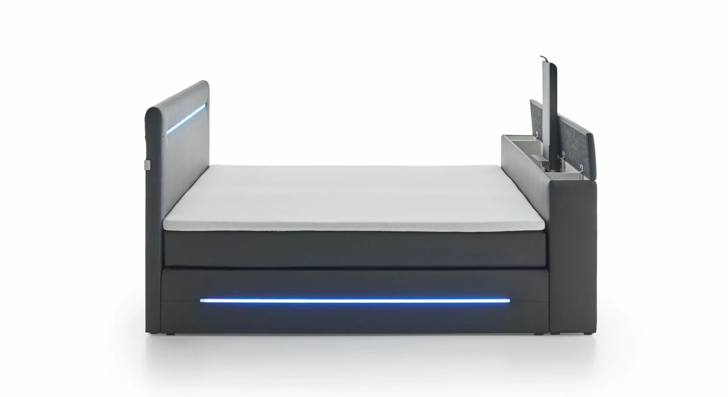 Zahlreiche nützliche Features und Funktionen lassen das Boxspringbett „Lucaro“ Express zum spannenden Allrounder werden. Neben der integrierten LED-Beleuchtung und praktischen USB-Anschlüssen am Kopfteil bietet Ihnen das Bettmodell eine elektrische TV-Halterung für das perfekte Heimkino-Erlebnis im Schlafzimmer.