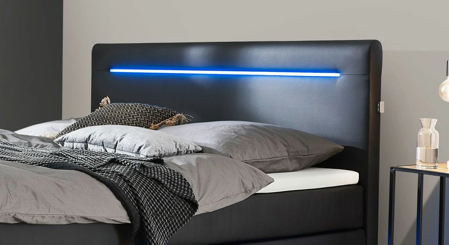 Beim Boxspringbett „Lucaro“ Express wurde wirklich an alles gedacht. Denn zu einem gemütlichen Filmabend gehört natürlich auch eine stimmungsvolle Beleuchtung. Dafür sind am Unterbau, dem Kopf- und Fußteil LED-Stripes angebracht, die das Schlafzimmer in ein modernes blaues Licht tauchen. Die Bedienung erfolgt ganz einfach über die Fernbedienung.