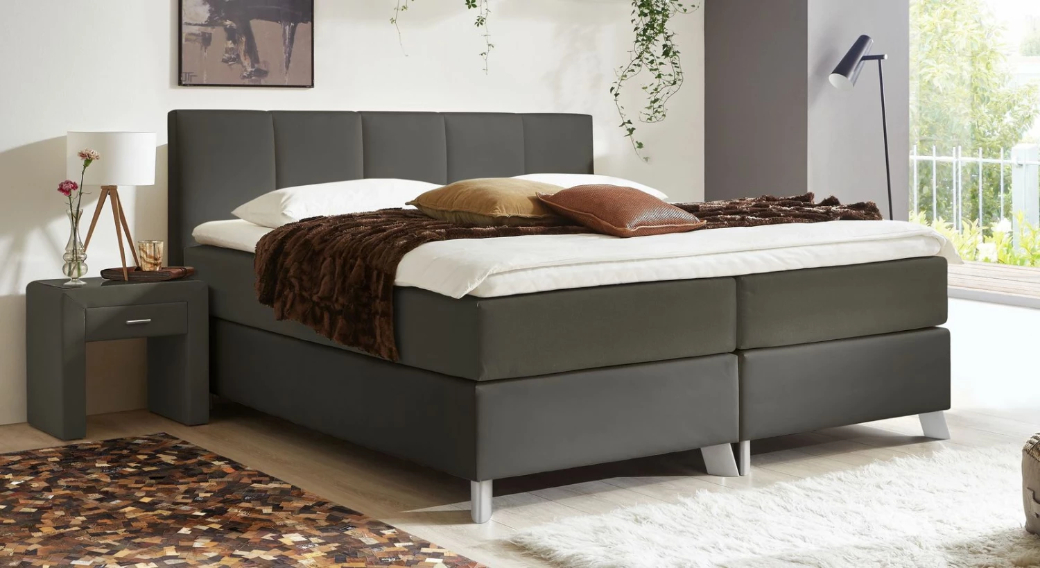 Ihnen gefällt das Bettmodell, Sie bevorzugen allerdings etwas dezentere Füße? Dann wechseln Sie einfach zu unserem Boxspringbett „Greenwood“, das über runde Bettbeine aus gebürstetem Aluminium verfügt.