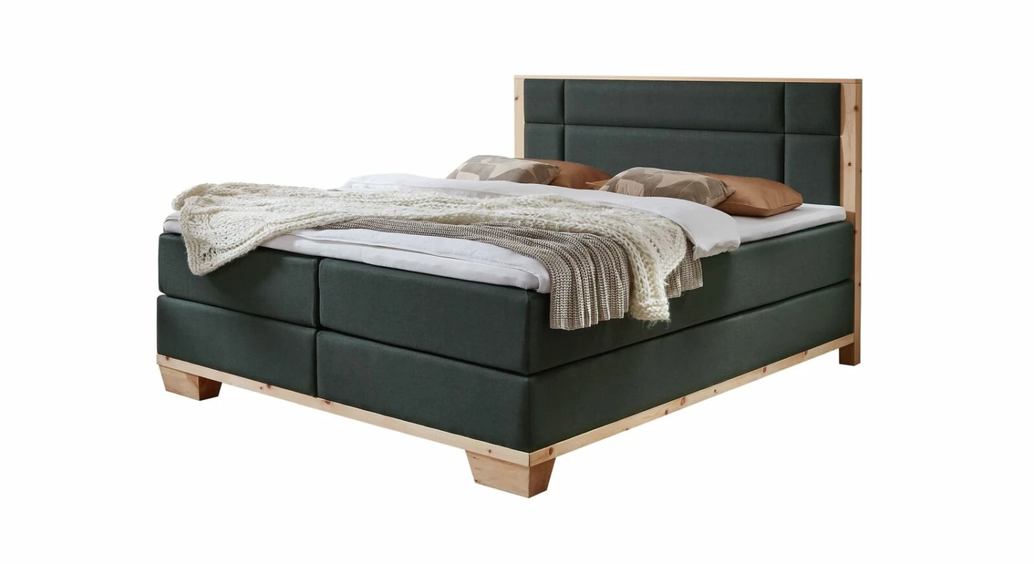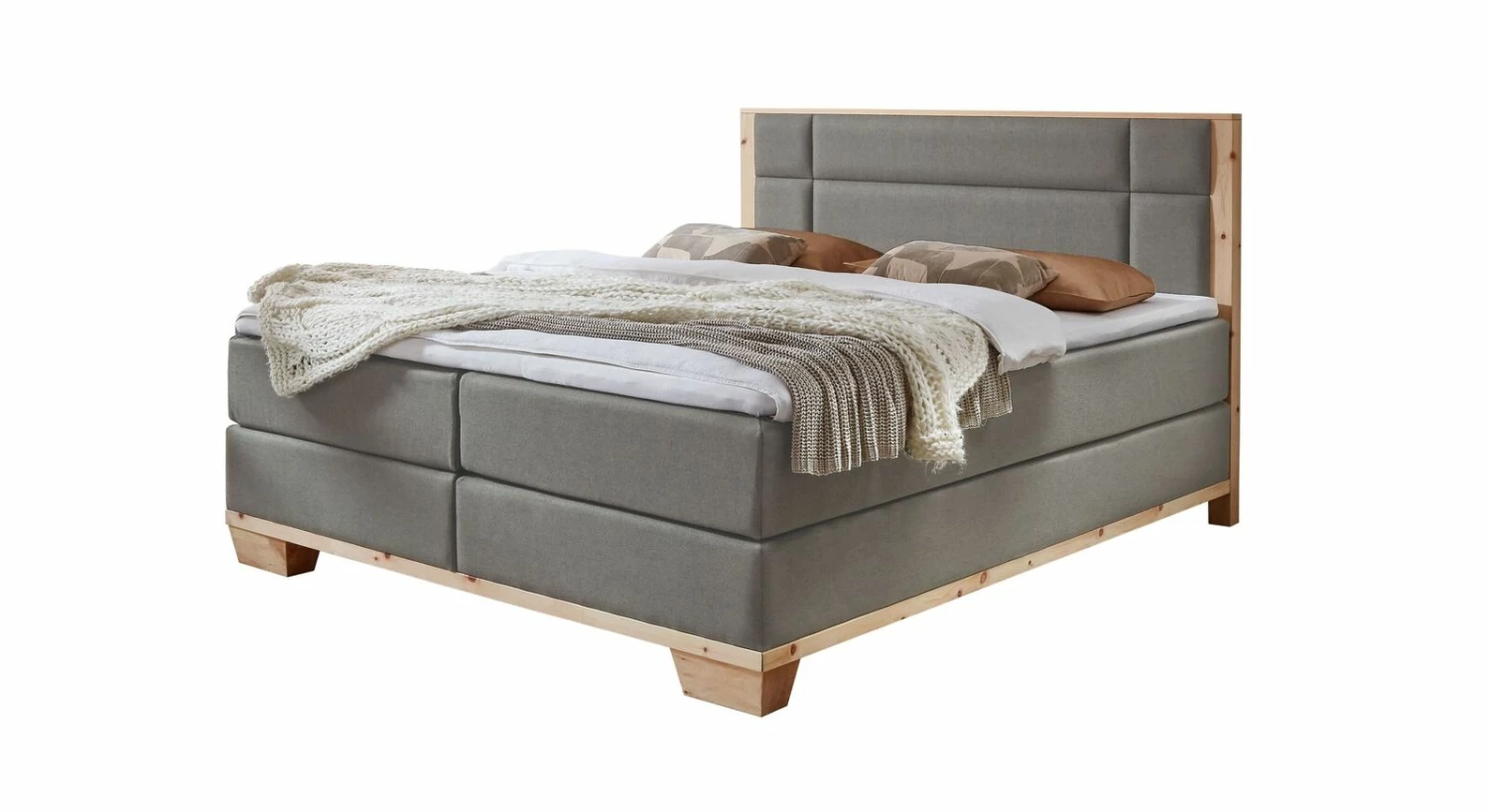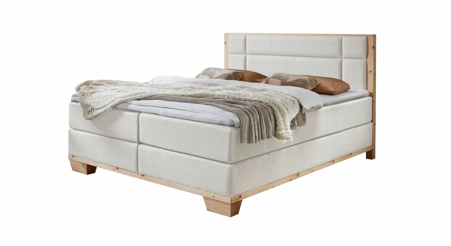 Gemütlichkeit in beeindruckender Optik: das Boxspringbett „Salonetto“ aus natürlichem Zirbenholz und Webstoff