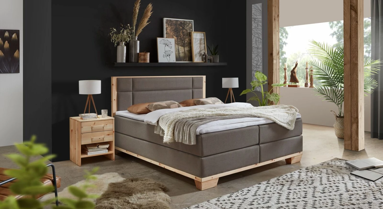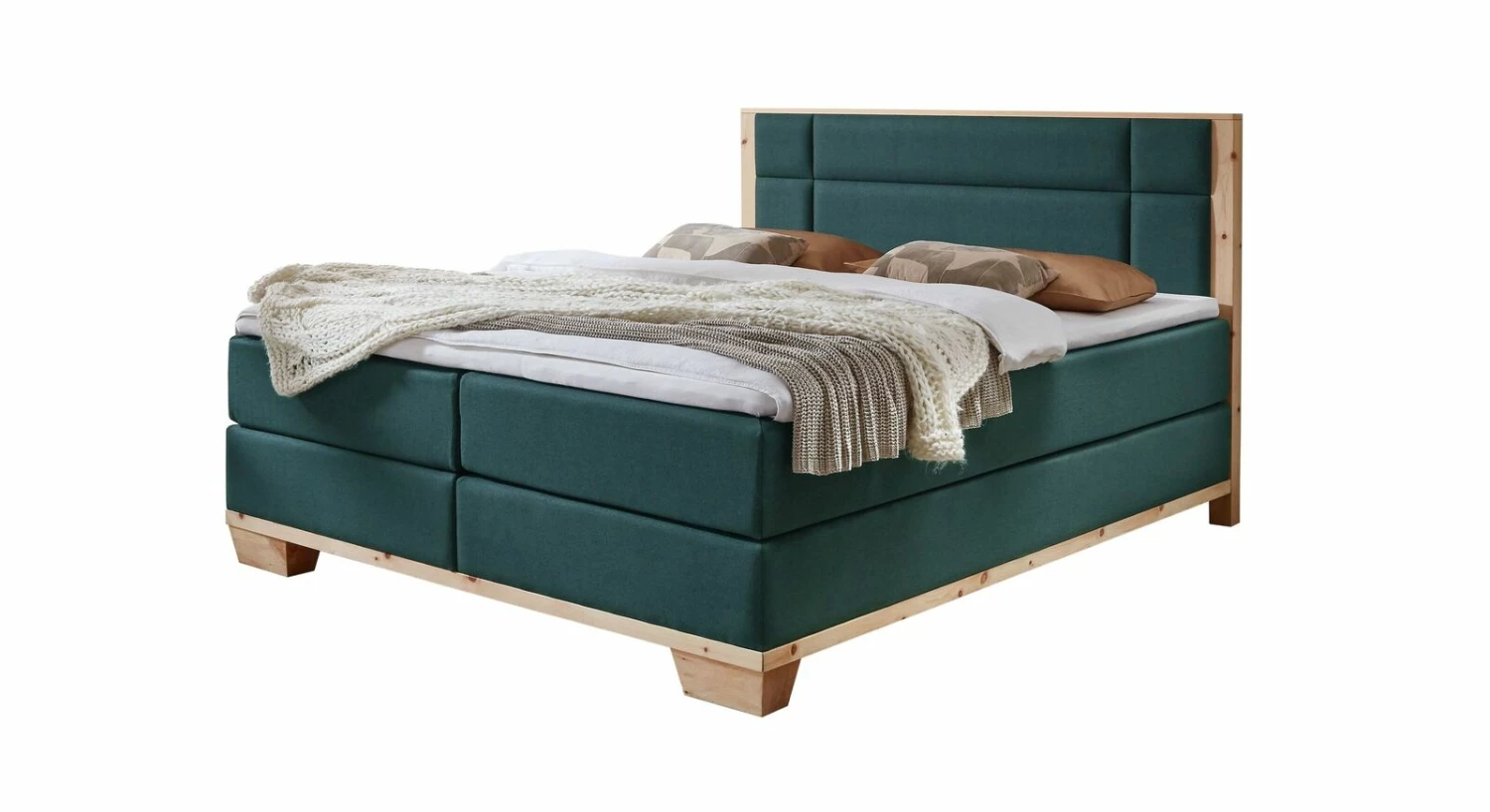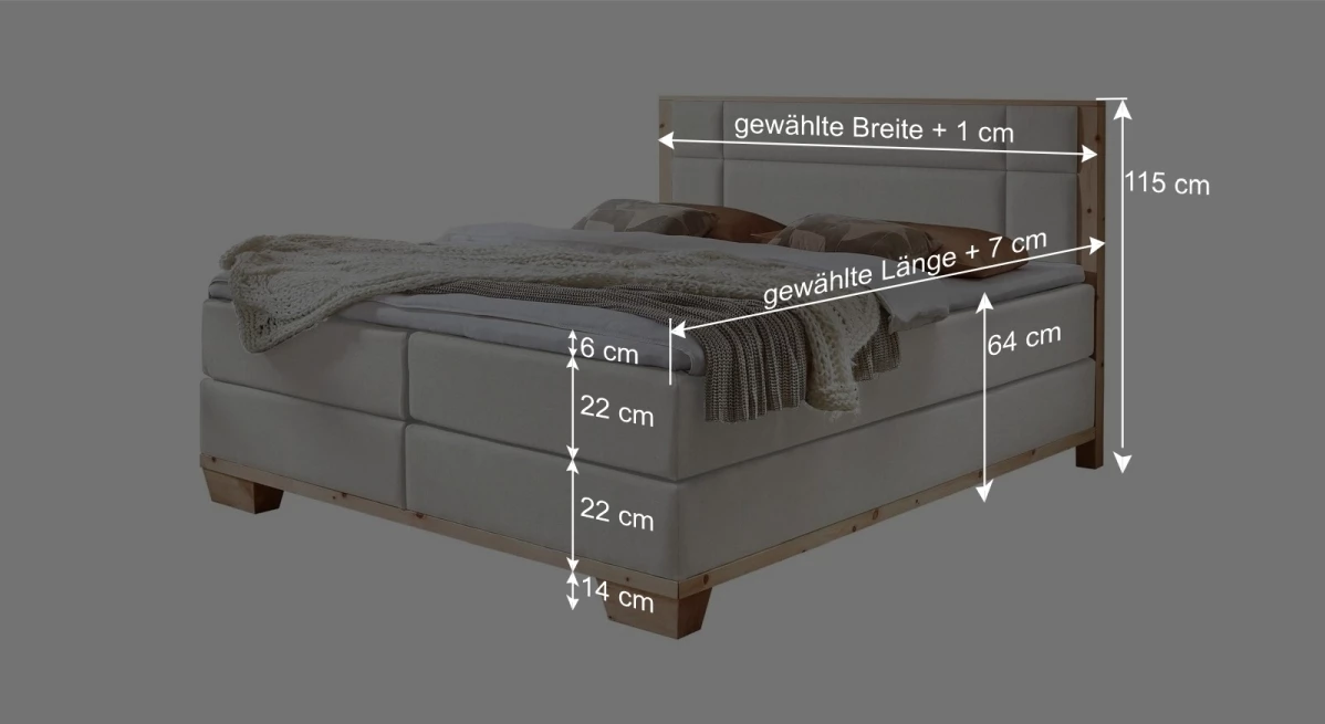 Gemütlichkeit in beeindruckender Optik: das Boxspringbett „Salonetto“ aus natürlichem Zirbenholz und Webstoff