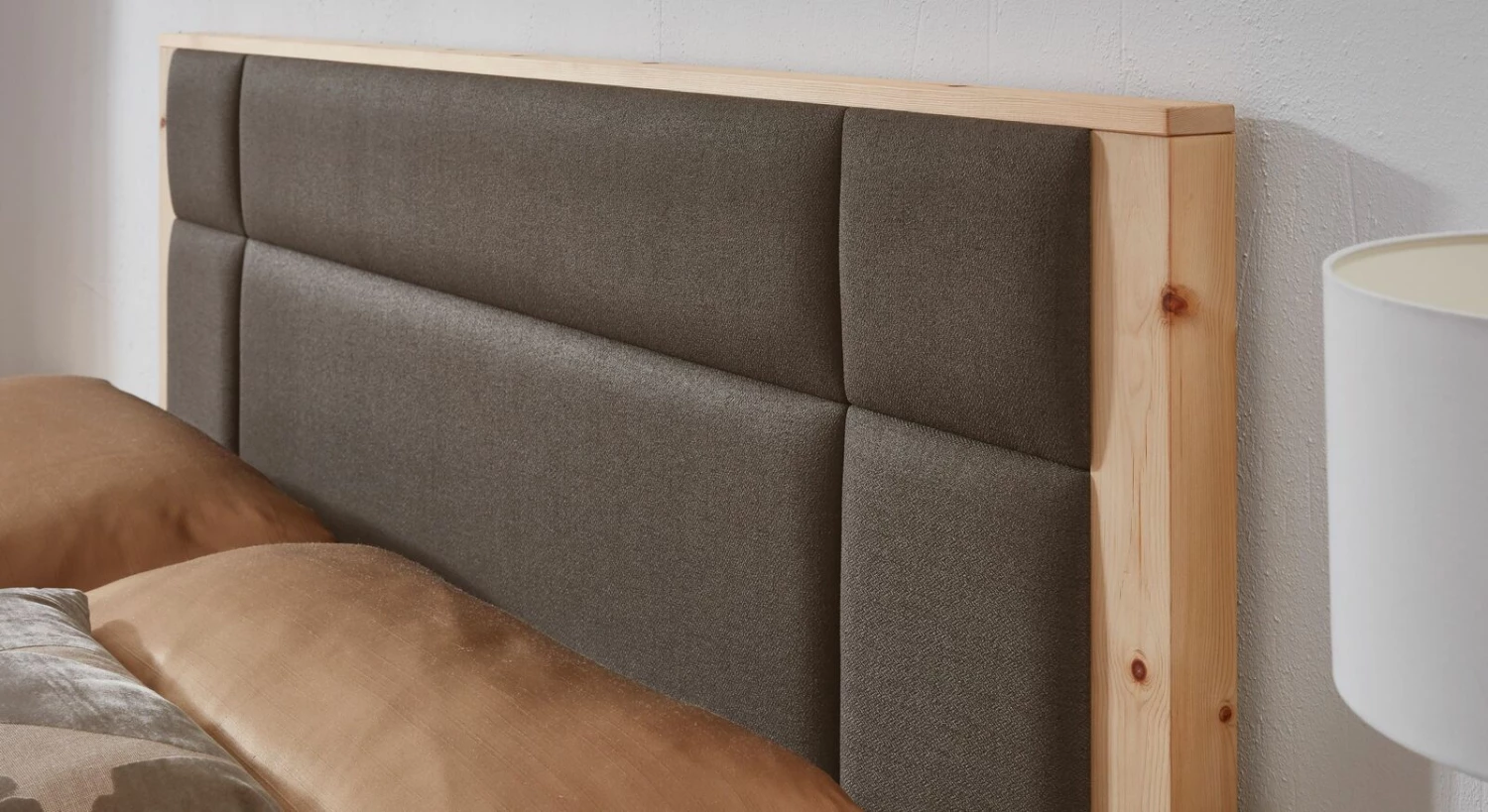 Für den benötigten Rückhalt sorgt zweifelsfrei das hohe gepolsterte Kopfteil, das sich als ein wahrer Blickfang erweist. Mit einer Gesamthöhe von 115 cm wird das textile Element in Kassettenoptik von der dahinterliegenden Konstruktion aus Zirbenholz elegant umrahmt und erhält so zusätzliche Stabilität. Lehnen Sie sich bequem zurück und genießen Sie die ruhigeren Stunden des Tages bei einem spannenden Film und einem guten Glas Wein.
