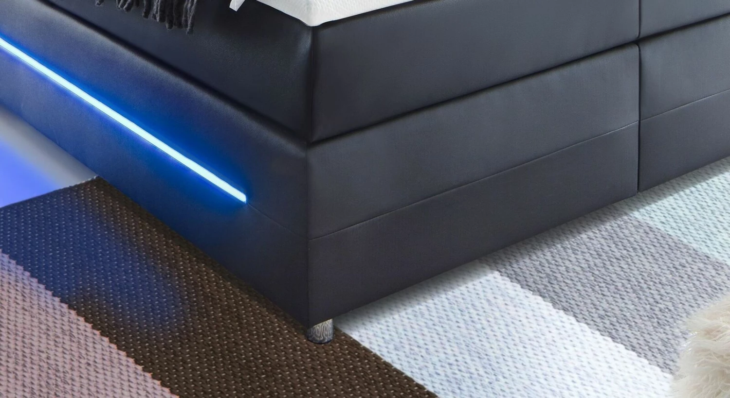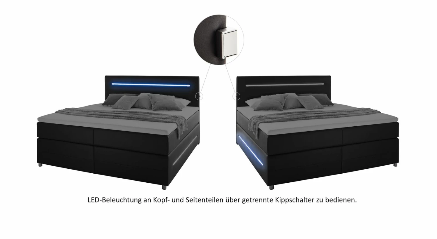 Für spannende Lichteffekte im Schlafzimmer sorgen die integrierten LED-Lichtleisten. Sie befinden sich am Kopfteil sowie an den Außenseiten der Boxen. Über einen praktischen Kippschalter lassen sie sich bequem ein- und ausschalten.