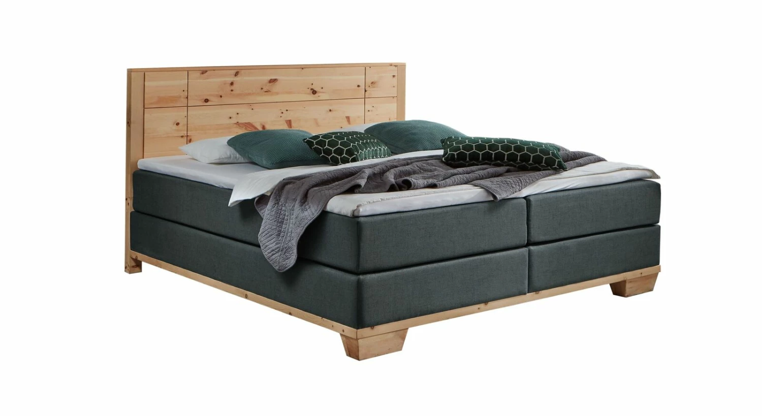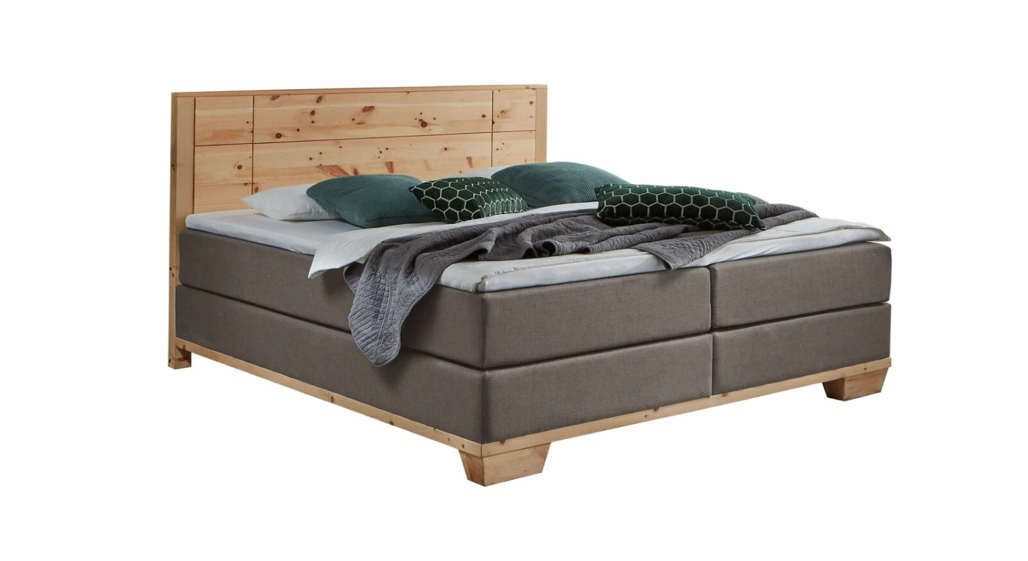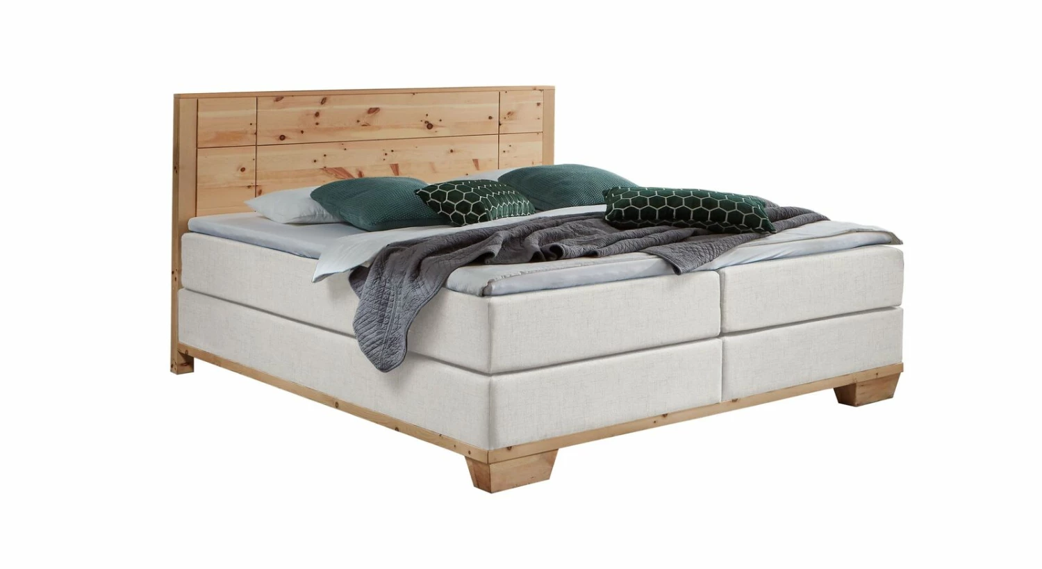 Stilvolles Boxspringbett „Sinestra“ aus natürlichem Zirbenholz im trendigen Farbmix