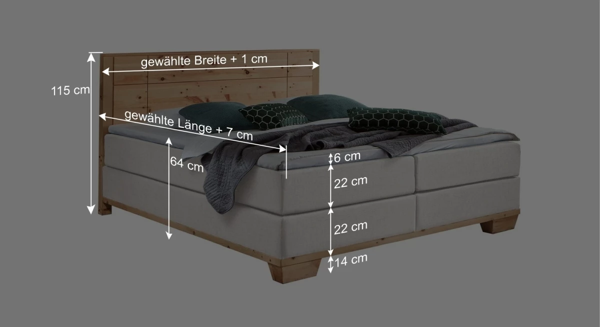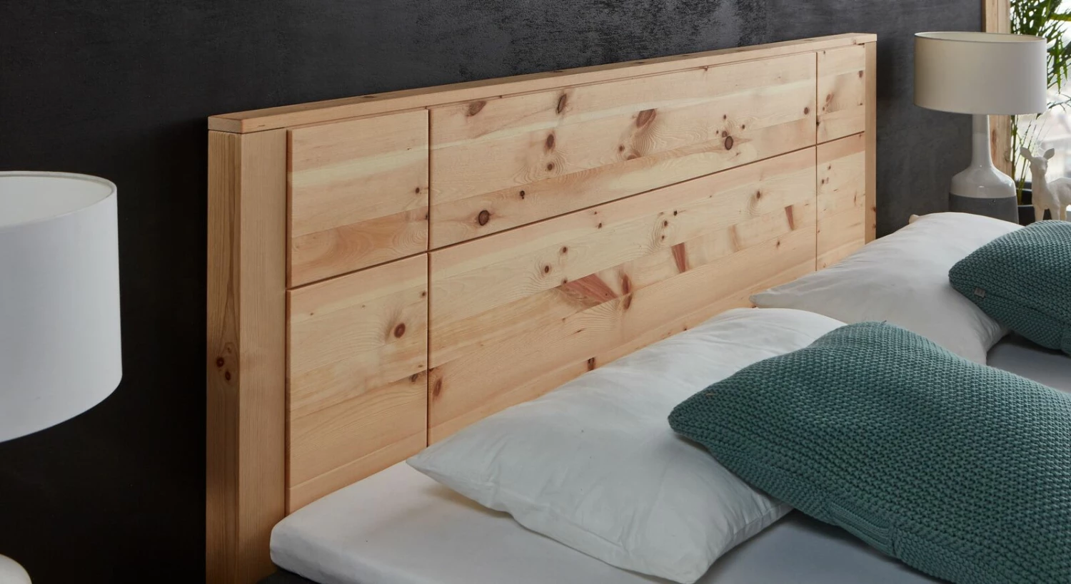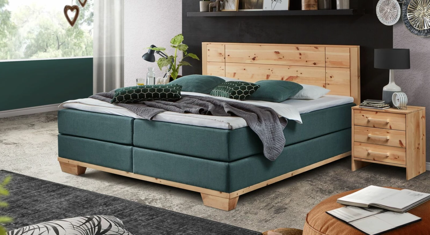 Stilvolles Boxspringbett „Sinestra“ aus natürlichem Zirbenholz im trendigen Farbmix