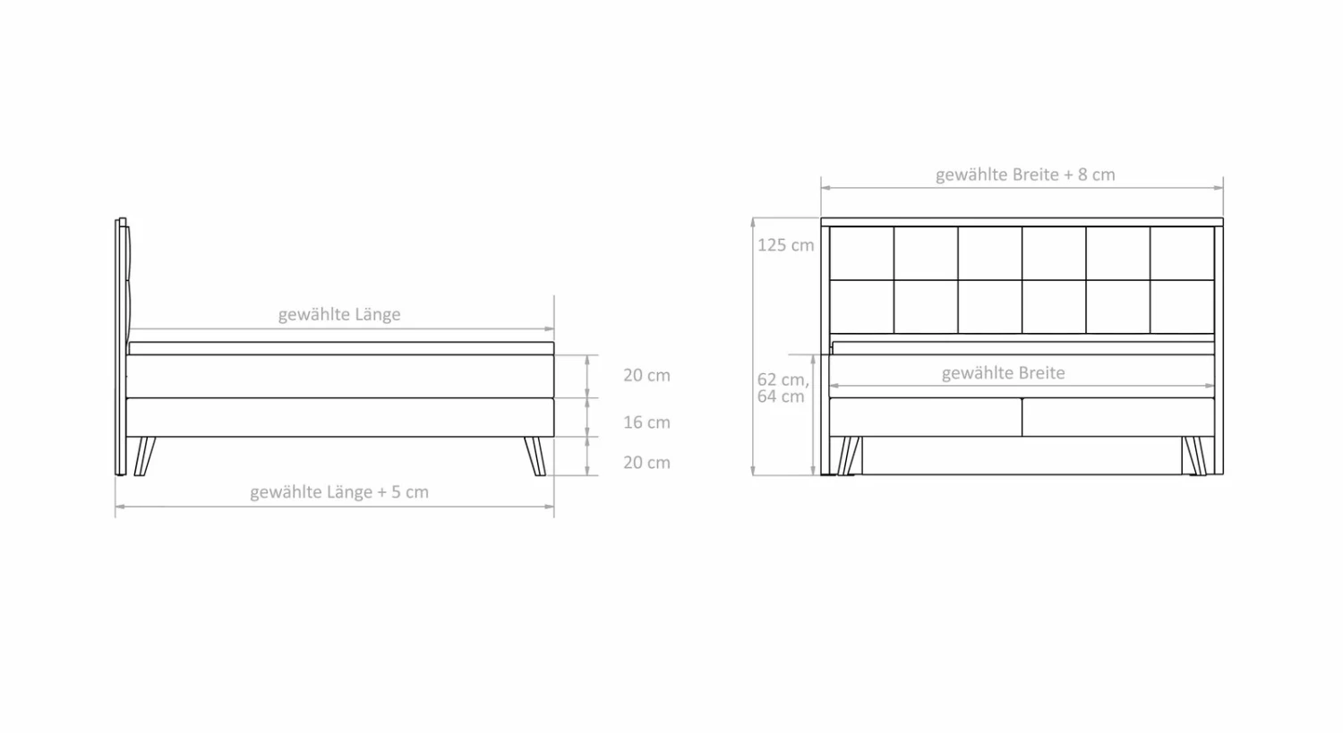 Als Basis des gesamten Liegesystems dient die Box. Sie besteht aus einem federnden Bonellfederkern, der für das typische Boxspringbett-Feeling verantwortlich ist. Sowohl die Box als auch die Matratze sind seitlich mit dem passenden Webstoff bezogen, sodass sich ein harmonisches Gesamtbild ergibt.