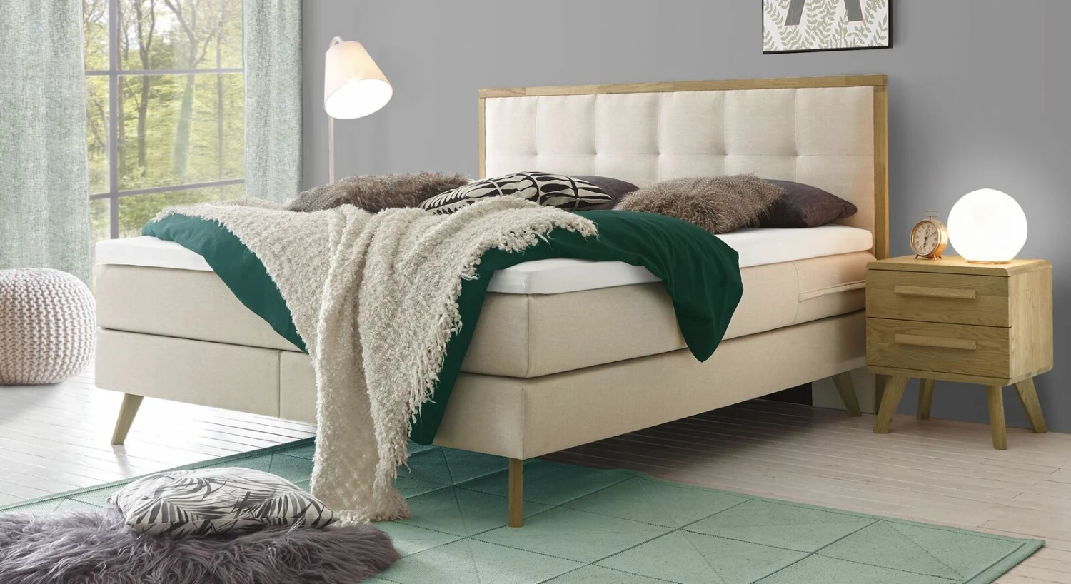 Elegantes Boxspringbett „Tistran“ mit gestepptem Kopfteil und ausgestellten Holzbeinen aus massiver Eiche