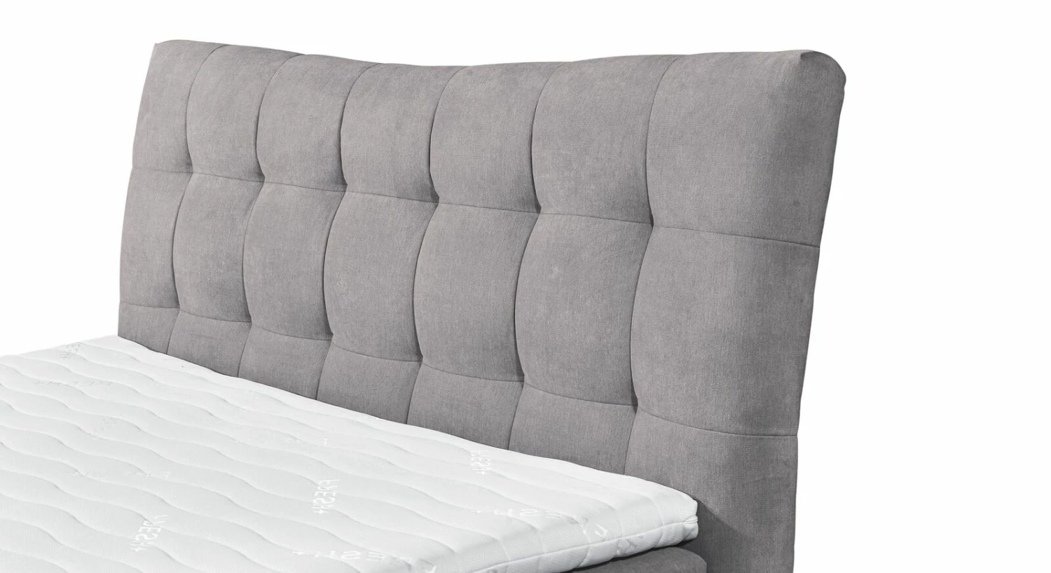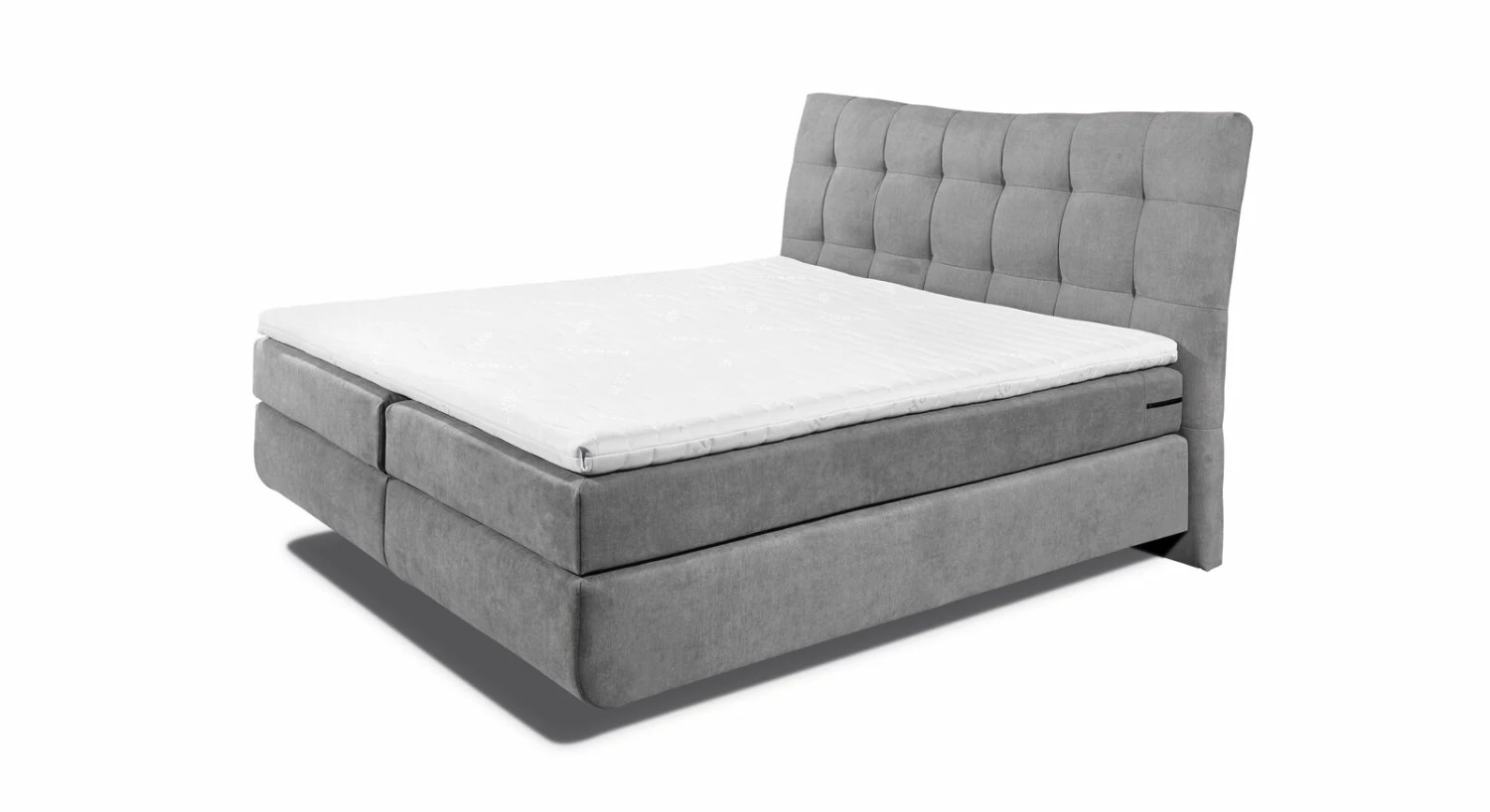 Box, Matratze und Kopfteil sind mit flauschigem Microvelours in einem zeitlosen Hellgrau bezogen, der sich wunderbar in die bestehende Einrichtung einfügt und leicht mit kräftigen oder dezenten Farbtönen kombiniert werden kann. Das hohe Kopfteil ist angenehm weich gepolstert und wirkt mit seiner großflächigen Quadratsteppung wie ein gemütliches Kissen. Durch die etwas höheren Ecken wird die lässige Kissenoptik noch zusätzlich betont.