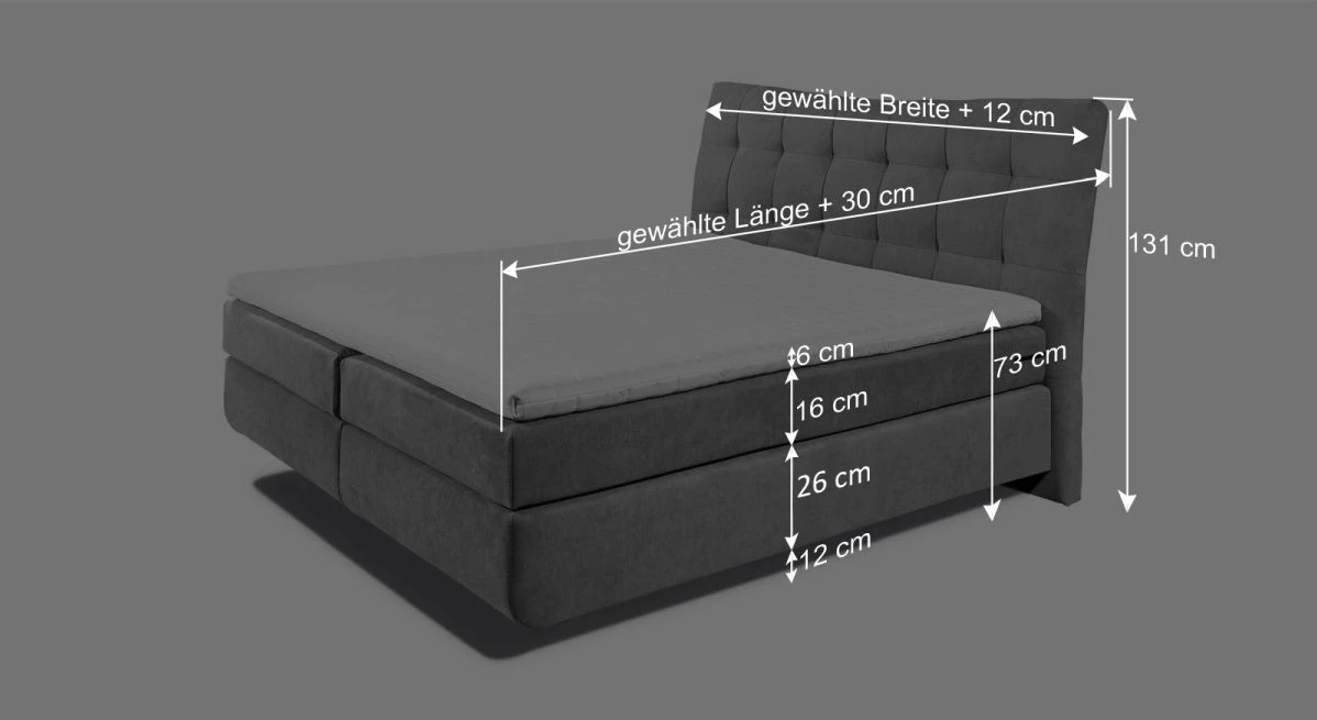 Der Aufbau des Bettes entspricht dem eines klassischen Boxspringbettes: ganz zu unterst befindet sich die stabile Box mit einem 4-Gang-Bonell-Federkern. Sie ist für das leicht federnde Liegegefühl verantwortlich und sorgt für die benötigte Stützkraft von unten.