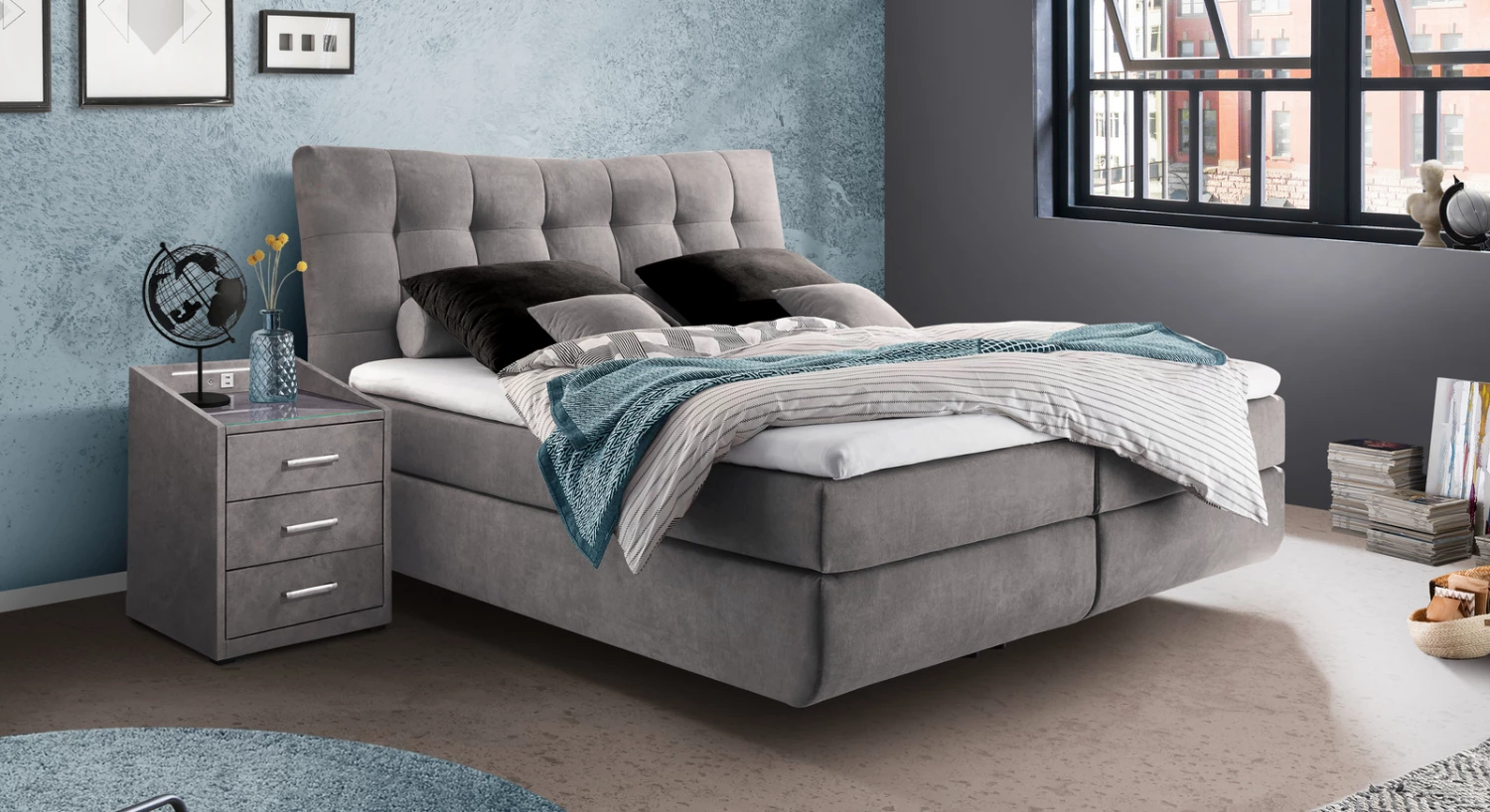 Kuscheliges Boxspringbett „Tobin“ bezogen mit grauem Microvelours in attraktiver Schwebeoptik
