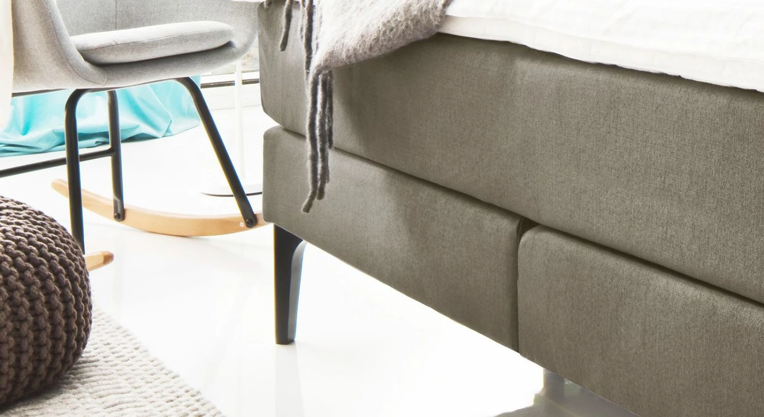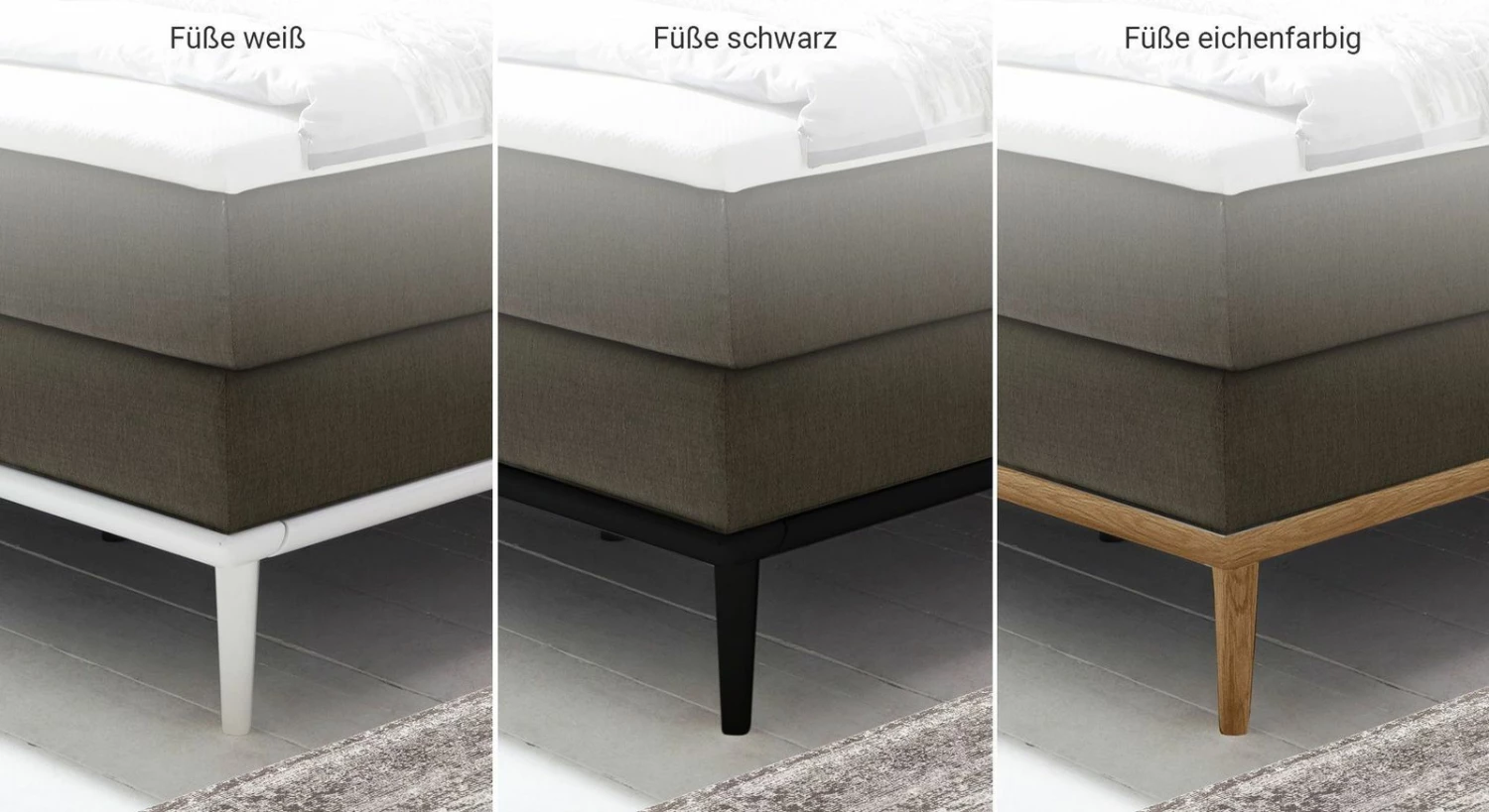 Einen angenehmen Kontrast zum Webstoff bilden die filigranen Füße aus Massivholz, die Ihnen in drei Farbtönen zur Auswahl stehen. Möchten Sie das Boxspringbett „Tromello“ stärker akzentuieren, erhalten Sie auf Wunsch Unterleisten aus Massivholz in der Farbe der Bettbeine. Diese zieren an drei Seiten die Unterkanten der Boxen.
