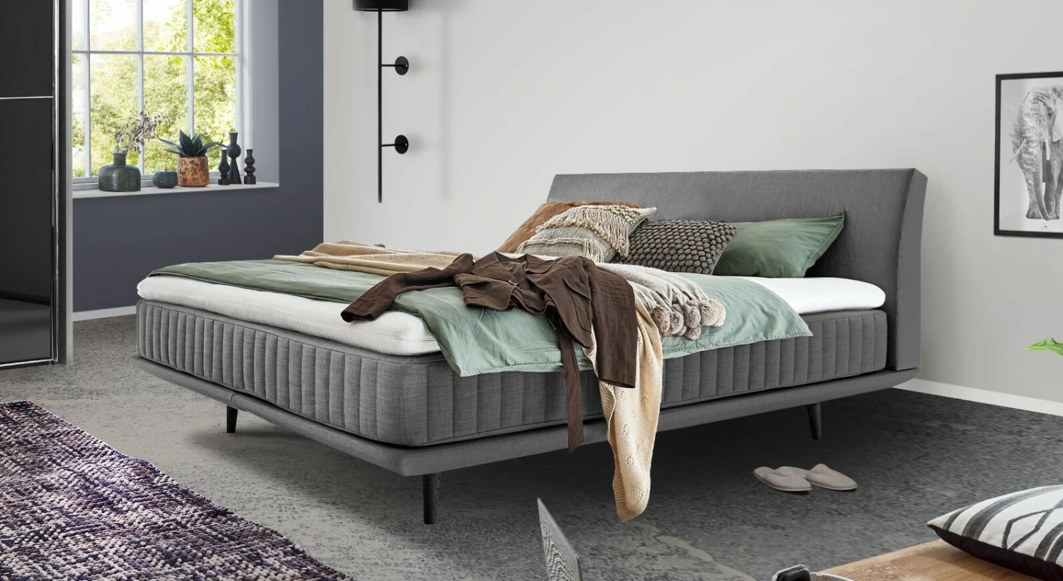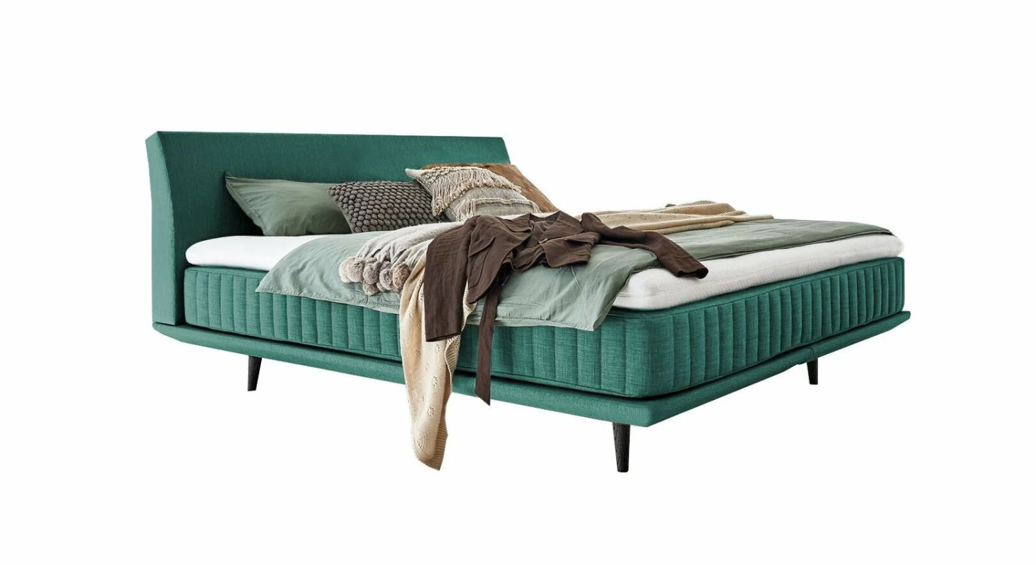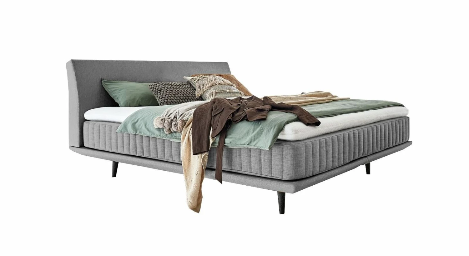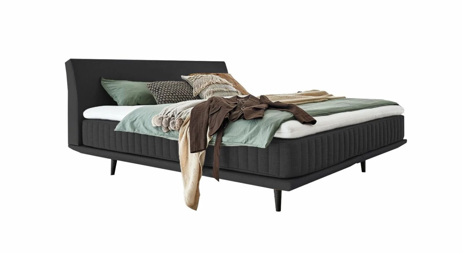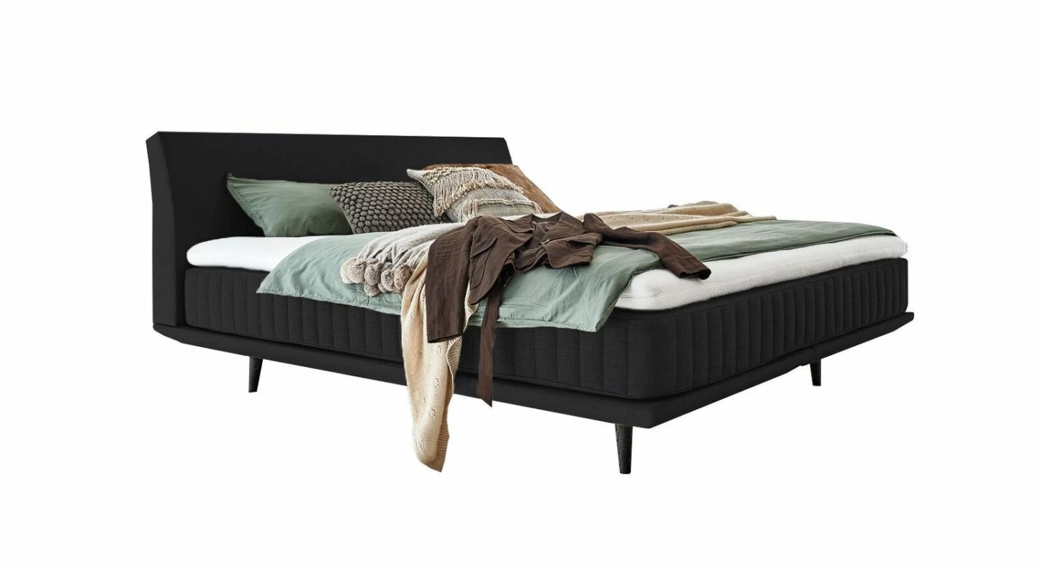 Sowohl das gewölbte Polster-Kopfteil als auch Box und Matratze sind mit einem angenehmen Bezugsstoff versehen. Für den luftigen Charme verfügt das Boxspringbett zudem über ausgestellte Füße aus schwarzer Eiche, die als tragendes Element für Box und Betthaupt dienen.