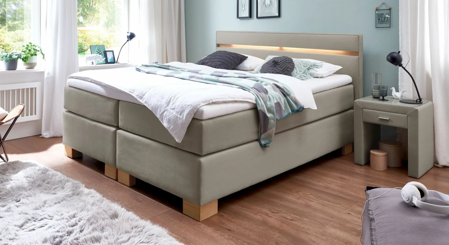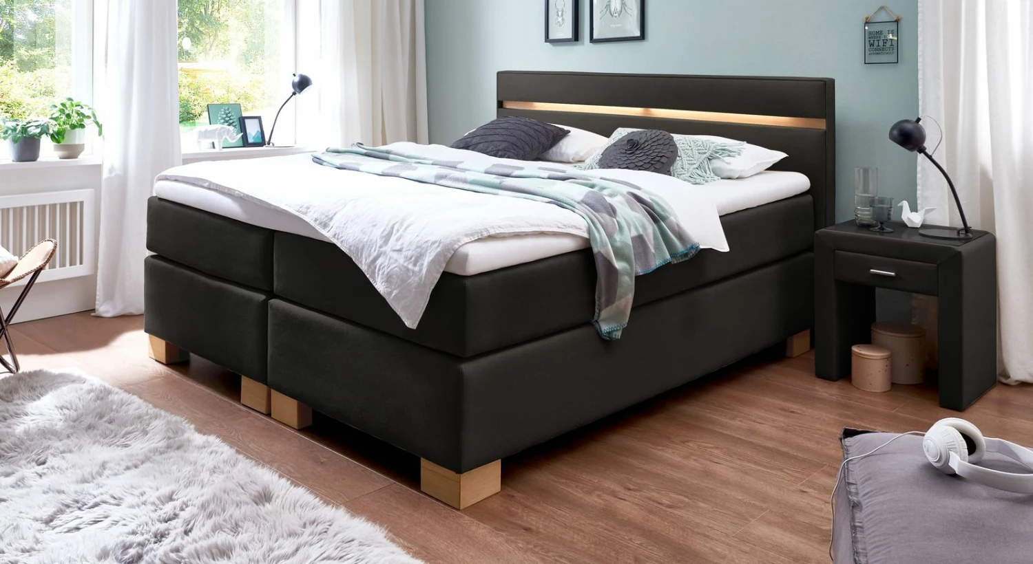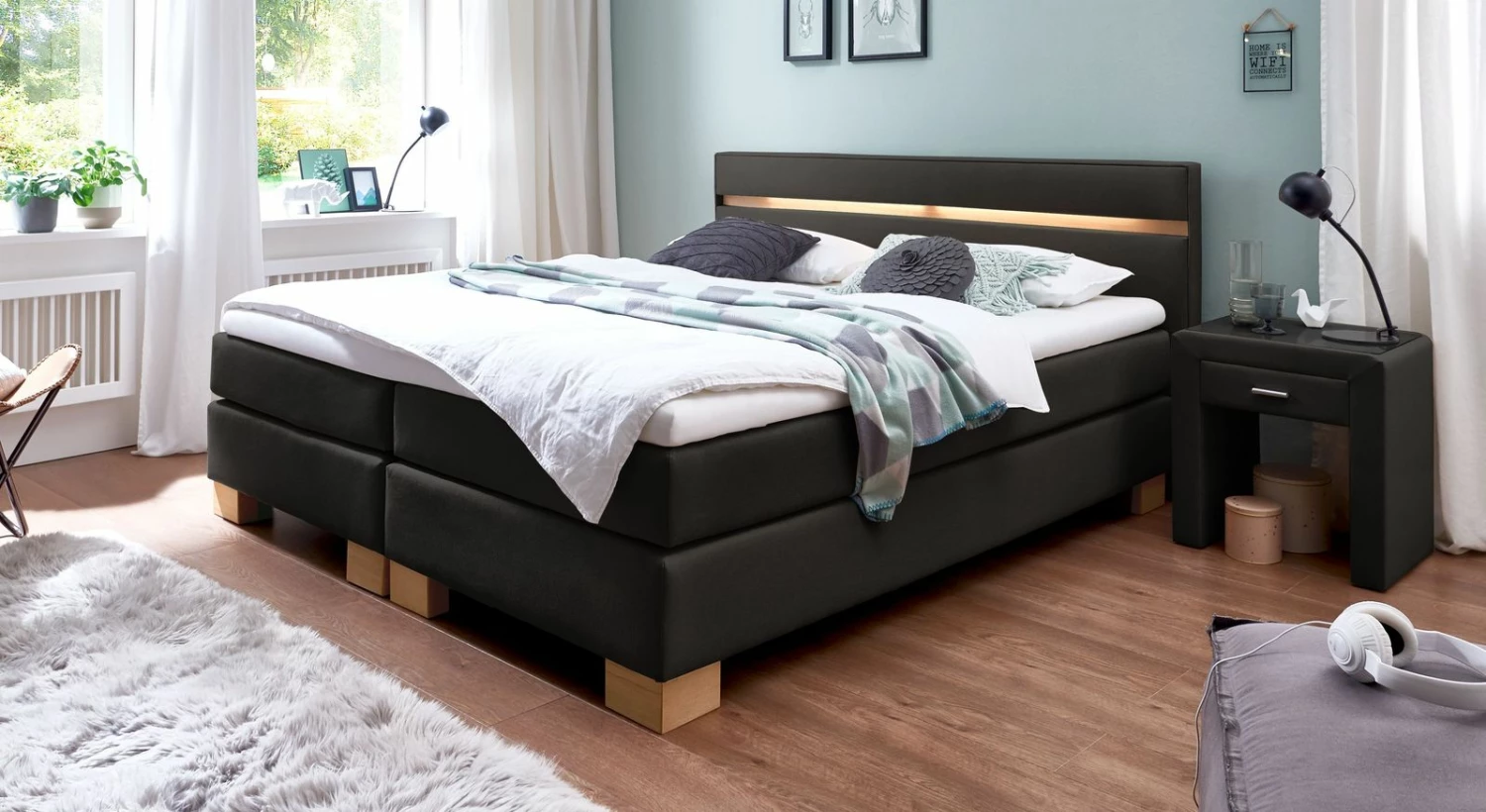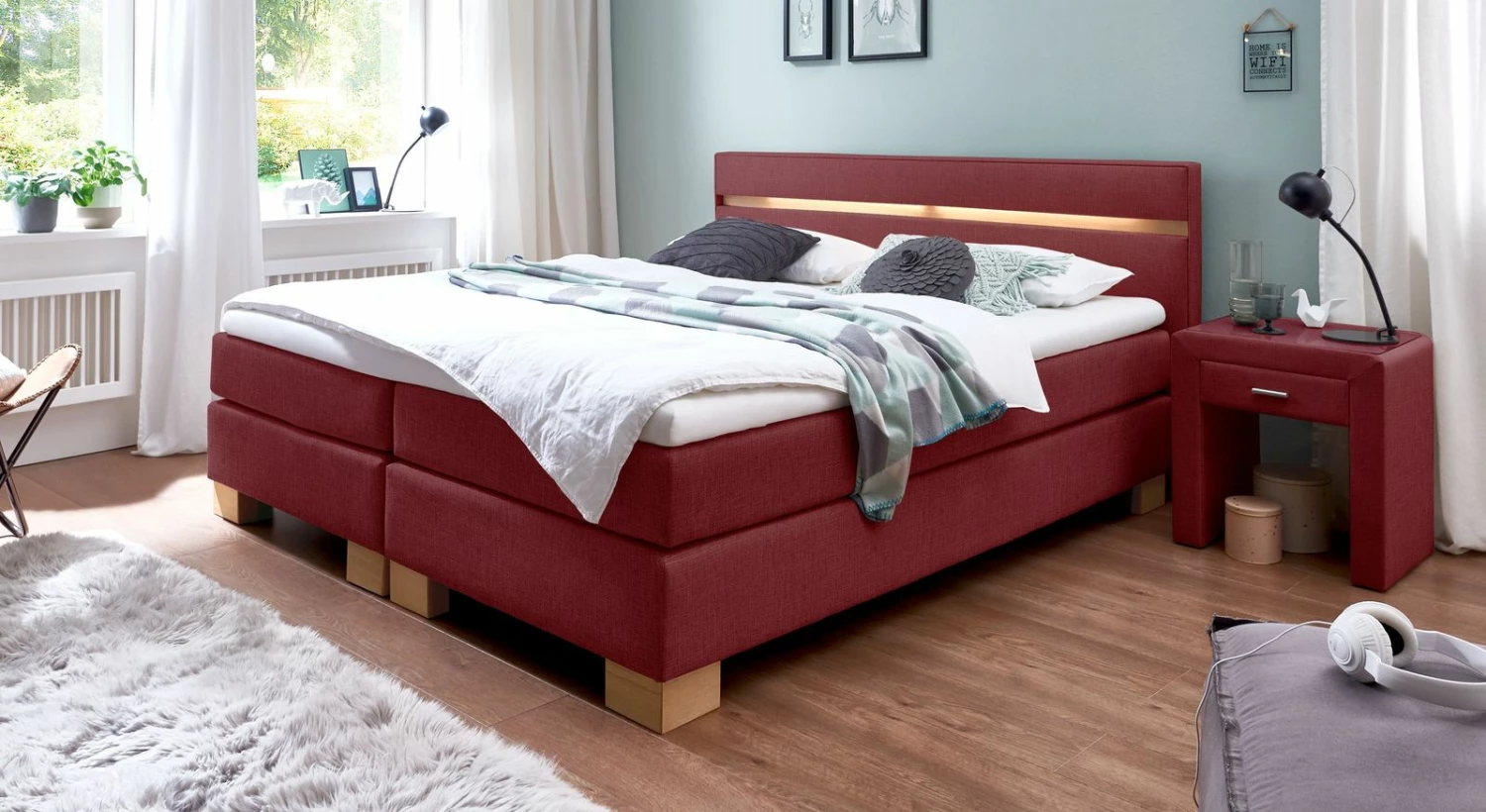 Wählen Sie entsprechend Ihrem Einrichtungs-Geschmack eine Farbe und Stoffart aus unserer großen Bezugskollektion. Besonders stilvoll wirkt Ihre Einrichtung, wenn Sie eine Farbe wählen, die sich in anderen Einrichtungsgegenständen Ihres Schlafzimmers wiederfindet. Oder setzen Sie gezielt Farbkontraste zu Boden- oder Wandfarbe.